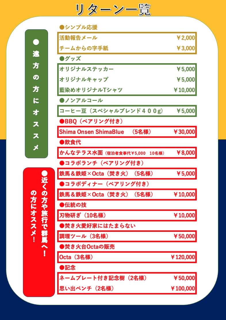 ●リターンについて、地域の協業者とのマッチングを通じて、リターン品の選定を始めました。以下品々を検討しています。
