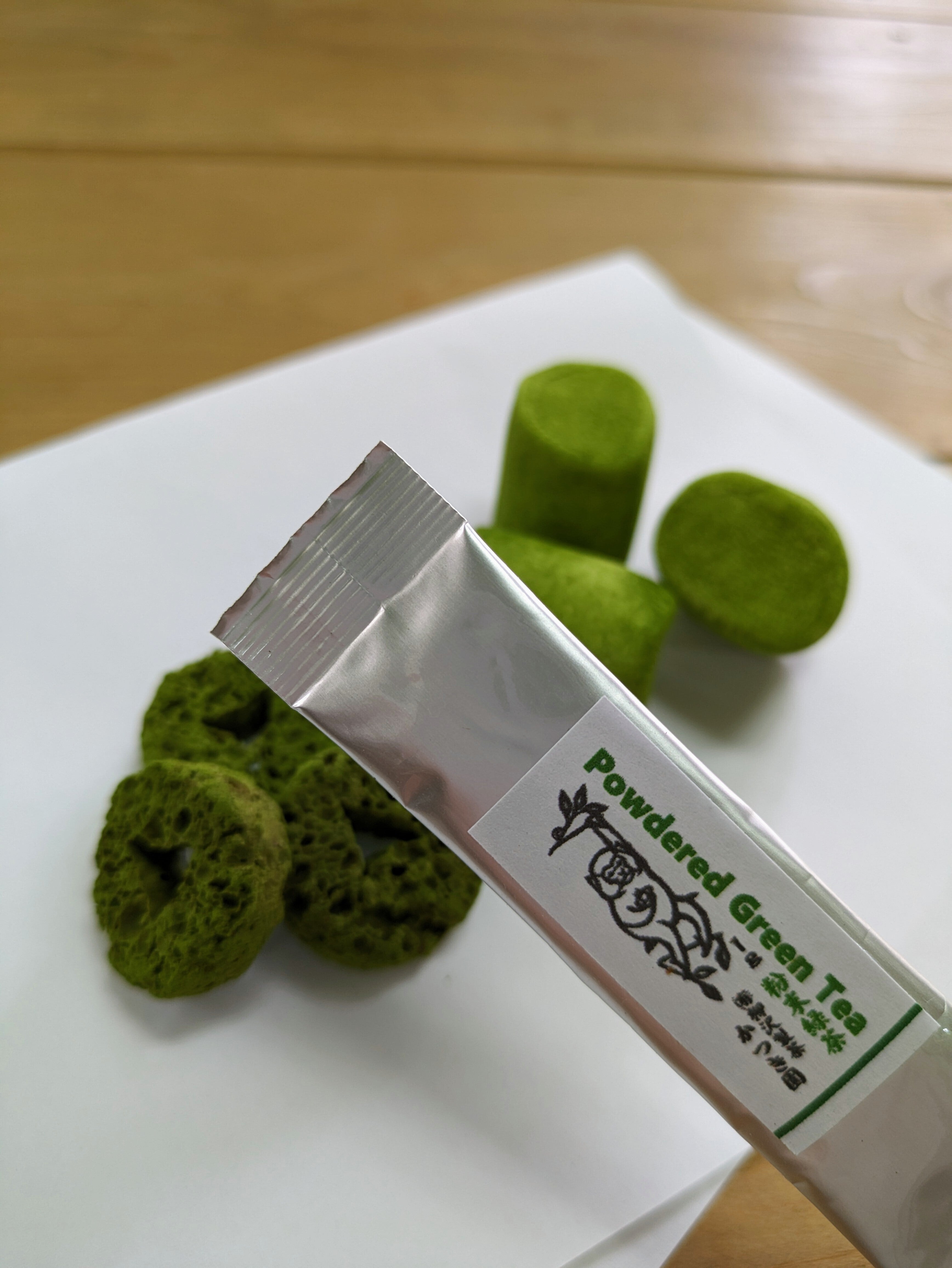 お湯、水、ミルクに溶かして飲むもよし、アイスクリームにかけるもよし、お料理やお菓子づくりにも使えます。市販の袋菓子に粉末緑茶1本を入れて口を閉じ、振り(シェイク)混ぜていただくと写真(しみチョコスナック&マシュマロ)のような大人おやつにも変身します…(^_^)ぜひぜひ、お試し下さい。