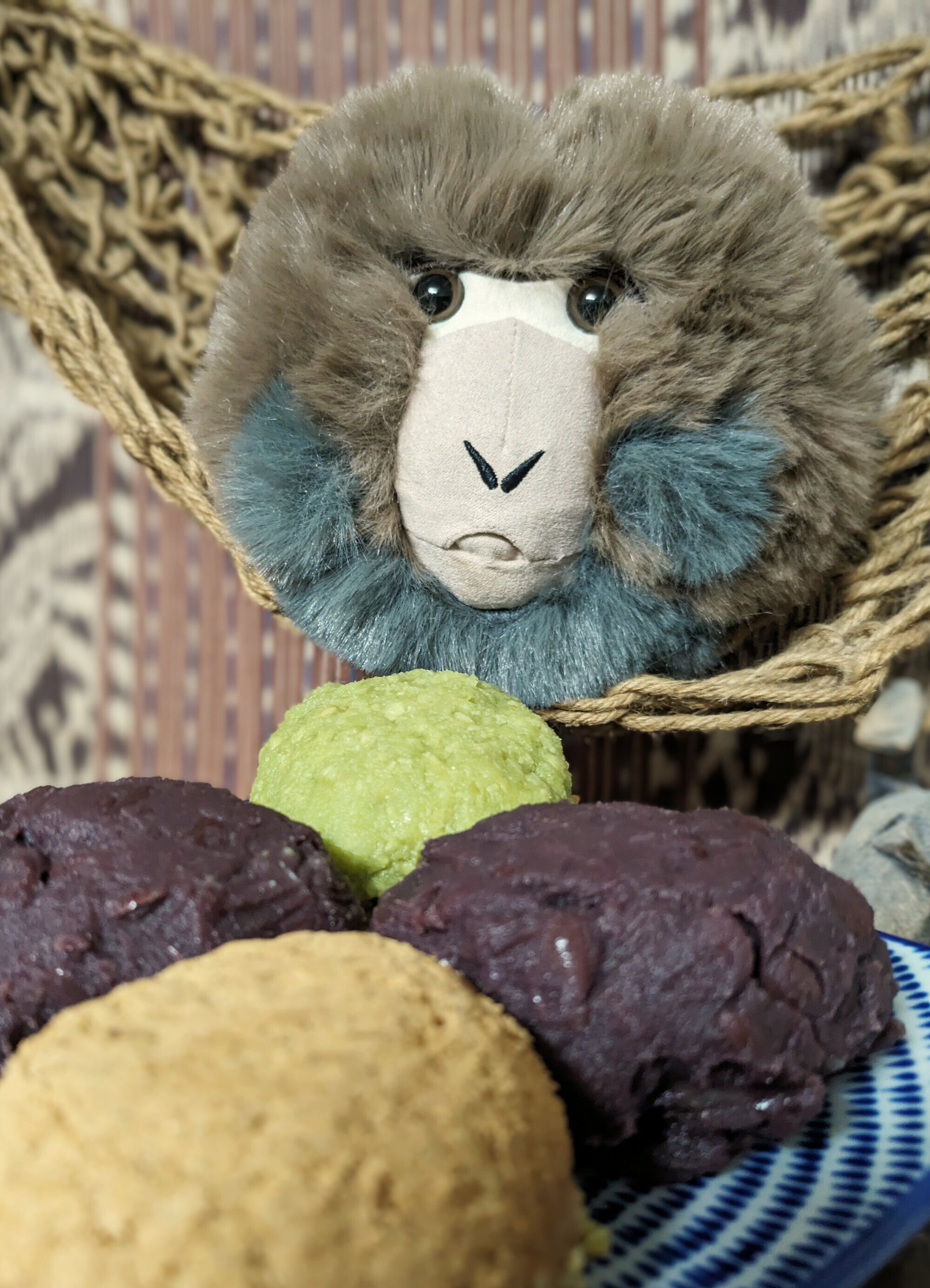 ザルバ様のファ~♪ポーチ。お顔の立体感を出すために前に詰めもの多めにしてます… ってどこかで聞いたけれど、そんな言うほど… と思っていたら、ハンモックに乗せても乗せても前のめりに転がり落ちるので( ゚Д゚)たしかに本物でした。(重心はマズルにあり)すごく可愛いですし口がファ…となってます。そんなザルバ様(の分身)とおはぎでお祝いしました。