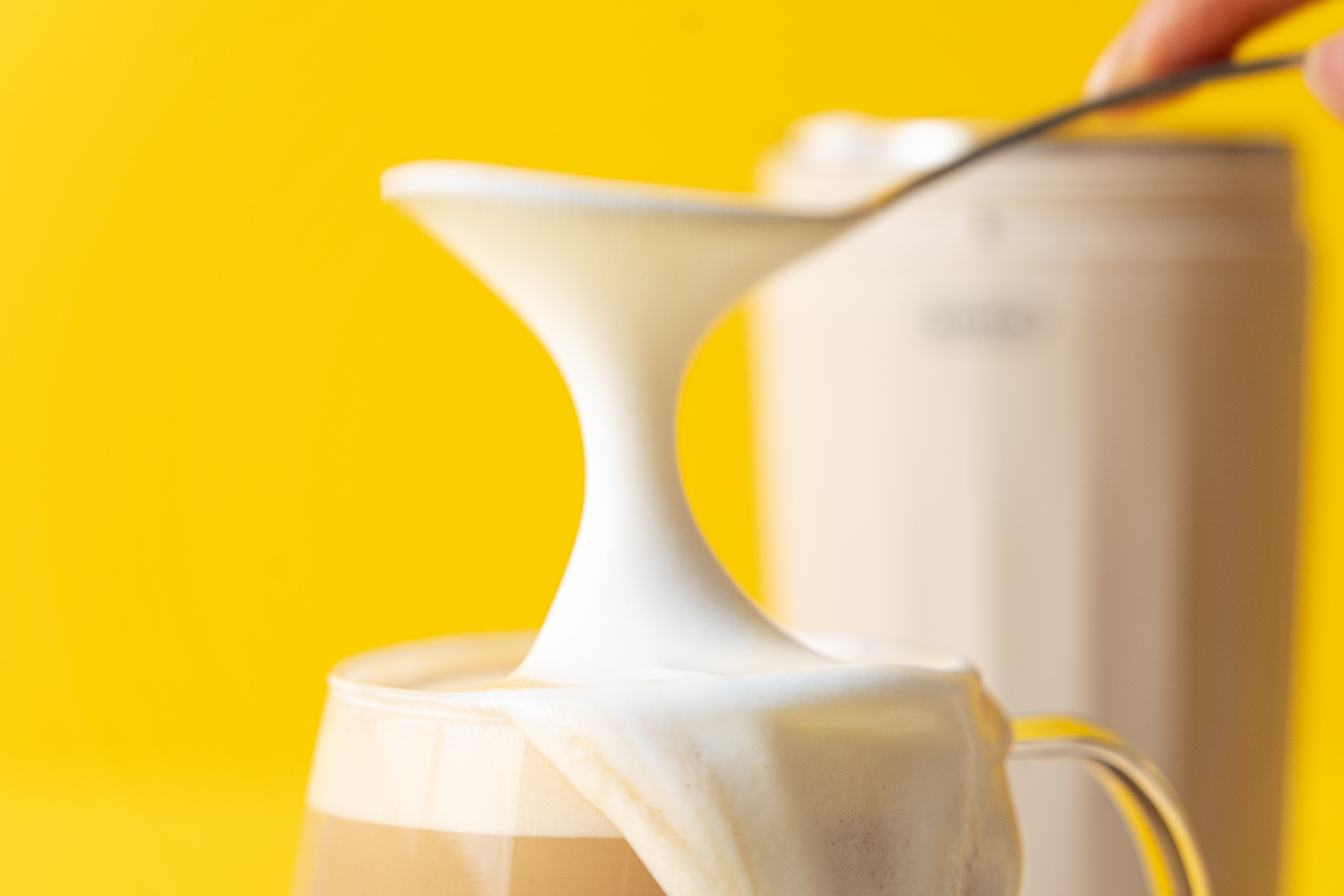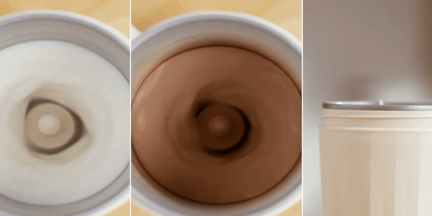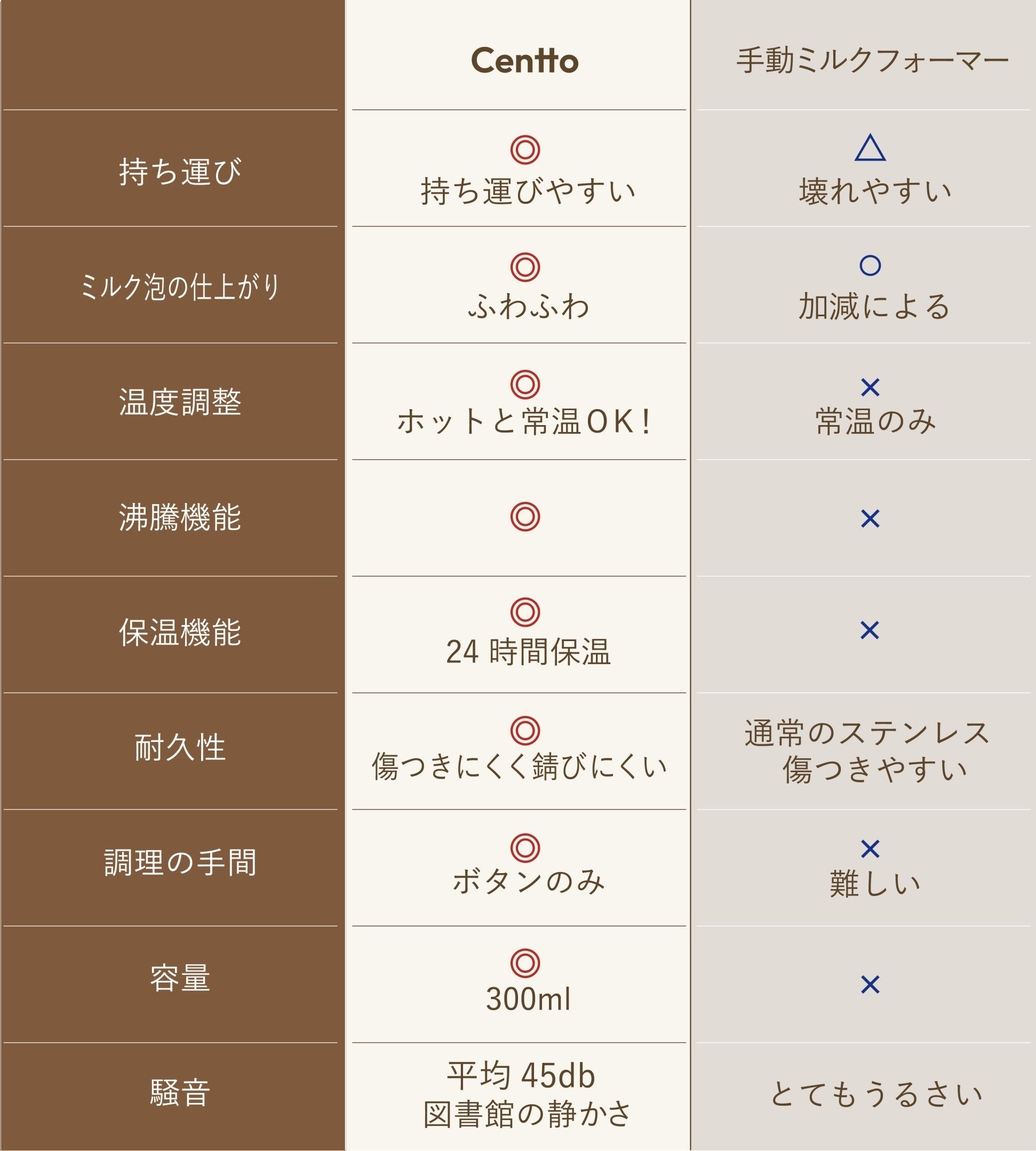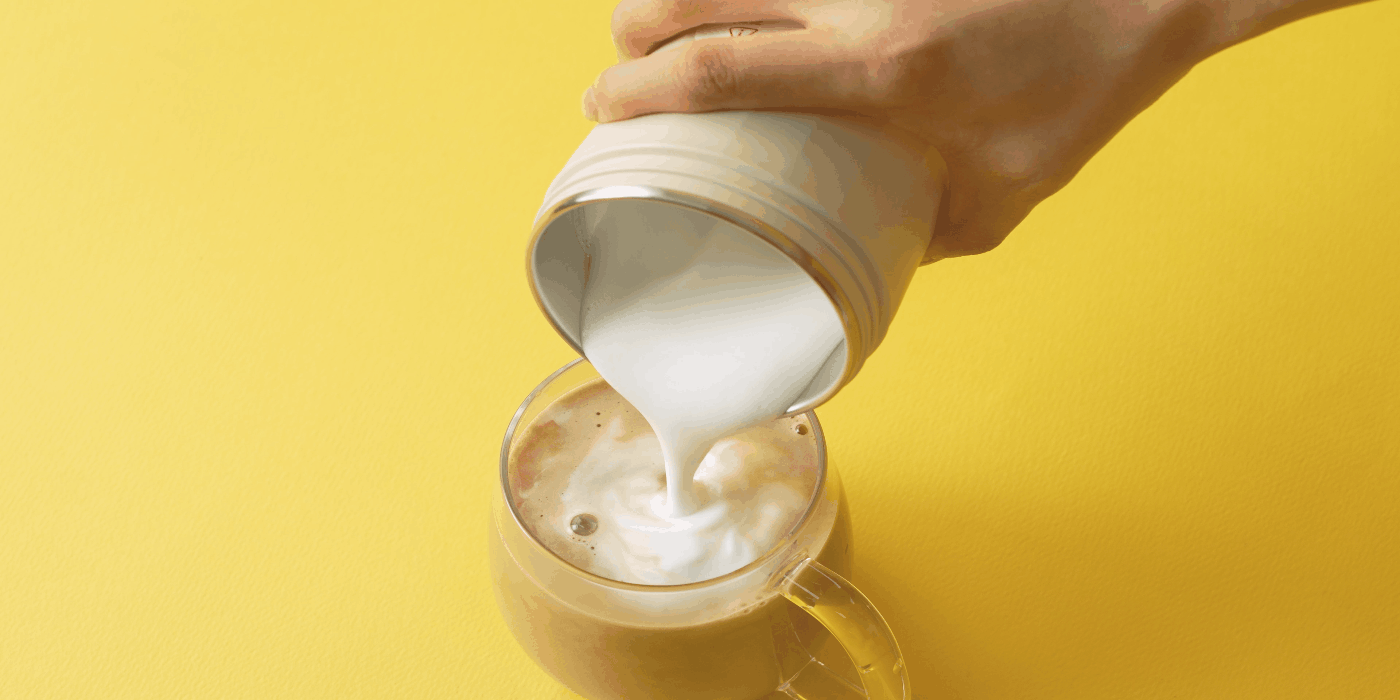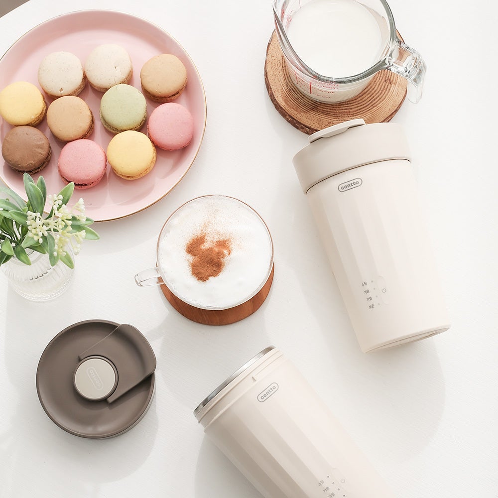 一般的にカフェのミルク泡は「スチームミルク」と言い、エスプレッソマシンで蒸気を発生させ空気を含ませる作り方です。そのため、水分を含んだ液状の薄いものになります。Centtoで作る「フォームミルク」は高速回転で空気を含ませる製法なので、牛乳100%のきめ細やかでふわふわな食感のミルク泡が出来上がります。Centtoはカフェを超える完成度の濃厚ミルクフォームが可能です。