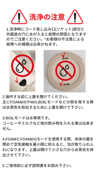 説明書の洗浄時の注意事項を必ずご確認ください。ミルクスチーム及び泡の使用後、すぐに綺麗な水で洗浄して頂き蓋を開けて自然乾燥して保管して下さい。本機器は家電製品のため、食器洗い機は使用できません。