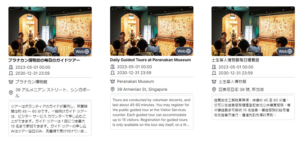 異なる言語にアクセス出来るこのサービスは、訪問者がその地域の文化やイベントを詳細に理解することを可能にします。また、イベントの日時や場所、アクセス方法が視覚的に表示されるため、検索の際、非常に便利です。