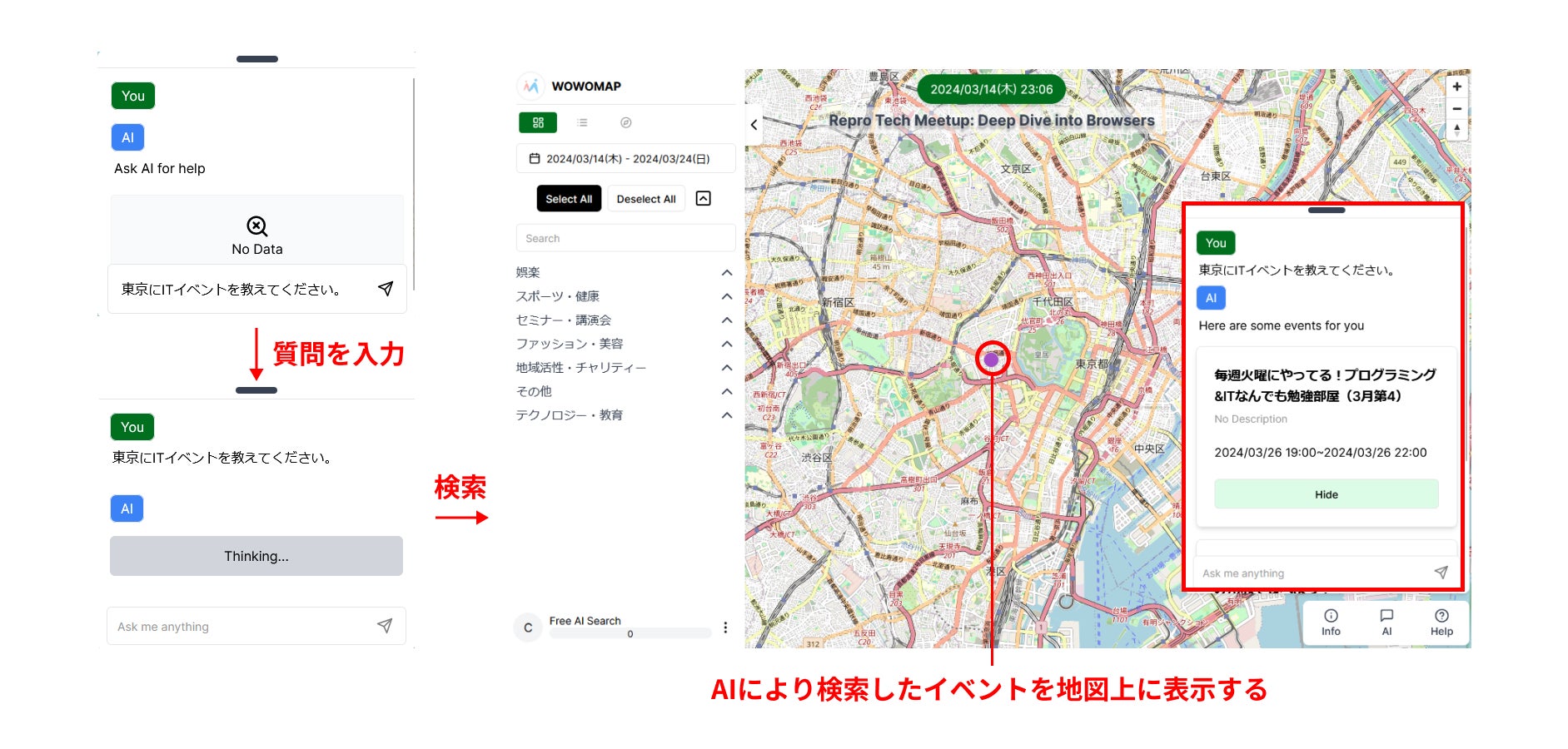 従来の検索サービスでは正確なキーワードを入力しなければ関連する情報を見逃すリスクが高く、新規追加されたものやマイナーなスポットが埋もれがちでした。『WOWOMAP』のLLMを用いることで、日常的な言葉を使った質問でも、直感的な検索が可能になり、ユーザーは具体的なキーワードを事前に知らなくとも、興味やニーズに応じた情報を簡単に見つけることができます。