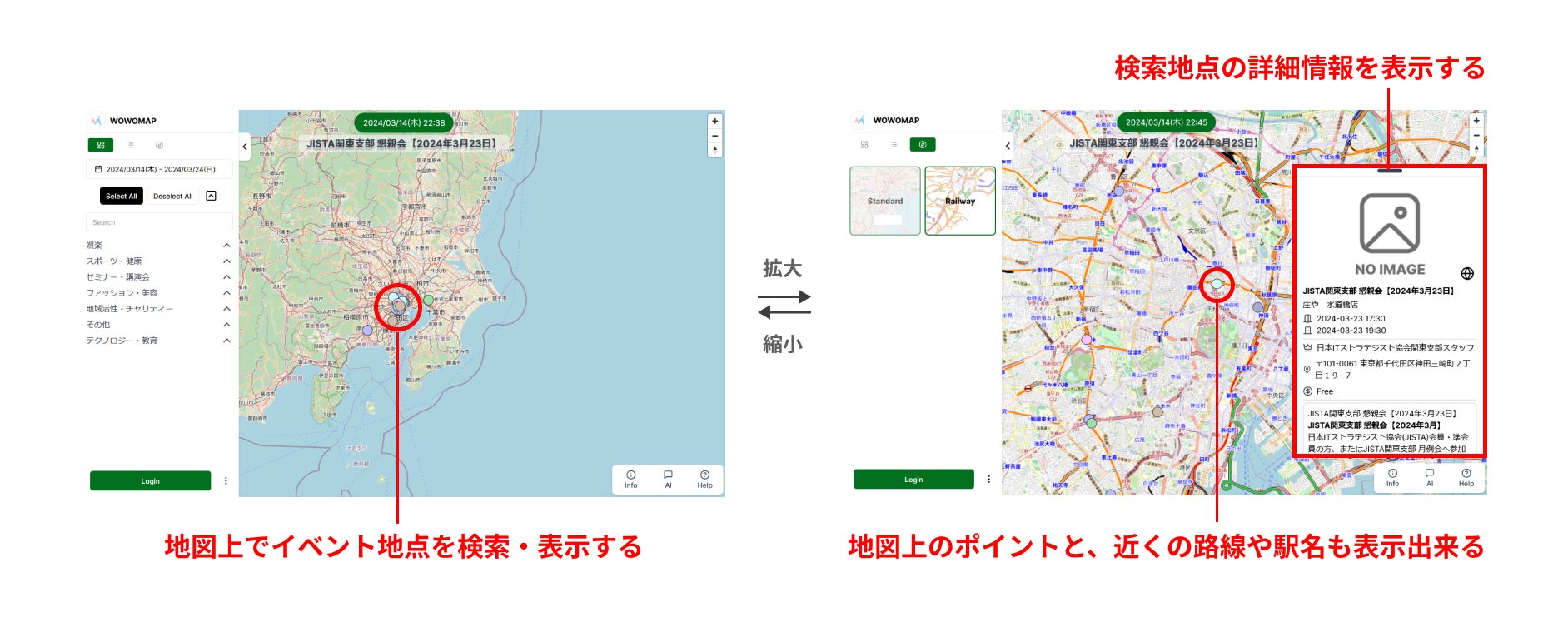 直観的なイベント地点の検索が出来るよう、視覚的な検索が可能です。特に地理的な位置関係を把握する場面で有効となります。ユーザーは地図を見るだけで興味のあるイベントがどこで開催されるのか、どのようにアクセスすれば良いのかを一目で理解できます。
