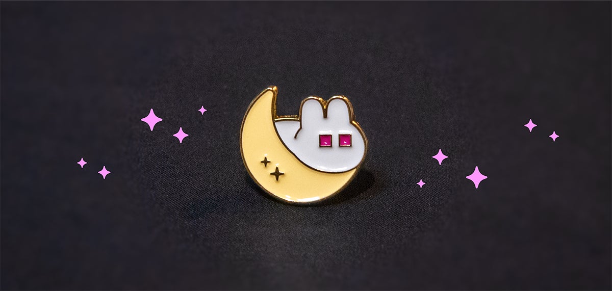 月に顔をのせて休んでいる主人公ウサギ・ピオの金属バッジ! 小さなサイズです。キラキラ輝くチーズムーンのシンボルをどうぞ。