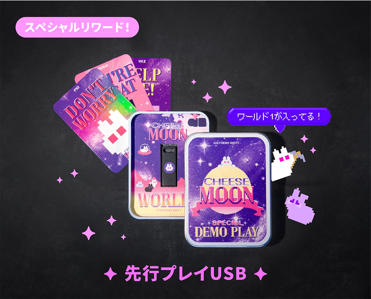 『チーズムーン』のワールド1を先行プレイできる実物のUSBをお送りいたします! 『チーズムーン』を発売前にプレイして、実物で所有できるチャンス!