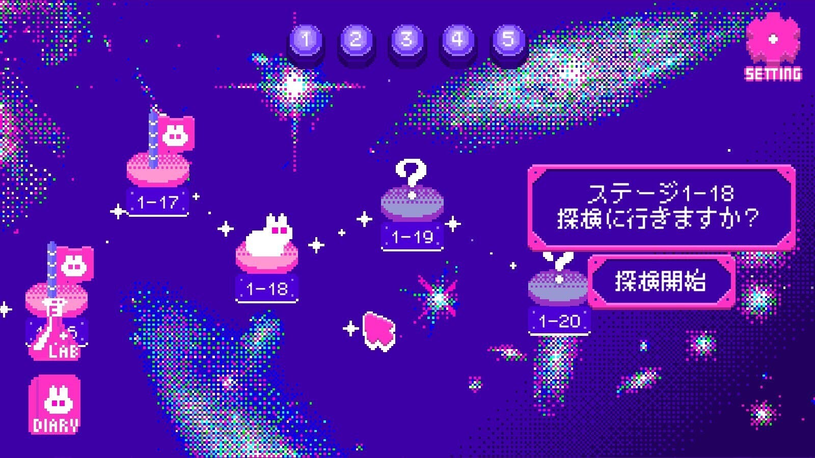 配信開始時点の体験版で、「STAGE1-17をクリアした時に次の画面に進まない」という不具合が確認されています。修正対応中です。いったんゲームを終了して、データをロードして再開すると、STAGE1-18が解放されていて、続きをプレイできます。ご不便おかけして申し訳ございません。