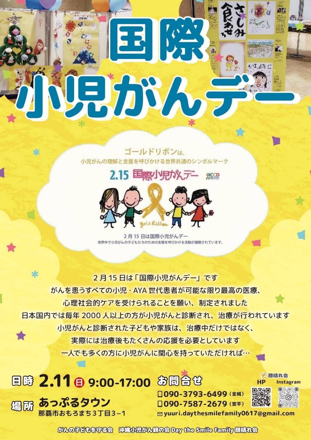 2月11日(日曜日)、那覇新都心のアップルタウンで「国際小児がんデー啓発イベント」を開催しました。ICCDのブースでは、多くの方々が立ち止まり、子どもたちの作品を観覧したり、闘病中の子どもたちへの応援メッセージを書いてくださいました。ご協力いただき、心から感謝申し上げます。また、募金にご協力いただいた方々も多く、合計で59,131円の募金が集まりました。深く感謝いたします。さらに、隣接するブースで「顔晴れ会」のグッズや「顔晴れスタンド」でドリンクを販売し、総額23,000円の売上がありました。売上げは全額、令和6年能登半島地震の義援金として寄付させていただきます。ご支援いただいたことに改めて御礼申し上げます。多くの方々からの寄付や温かい言葉に、本当に感謝しております。このイベントが、より多くの方々に小児がんおよび「顔晴れ会」について知っていただくきっかけになったと信じています。これからも変わらぬご支援と応援を、心よりお願い申し上げます。