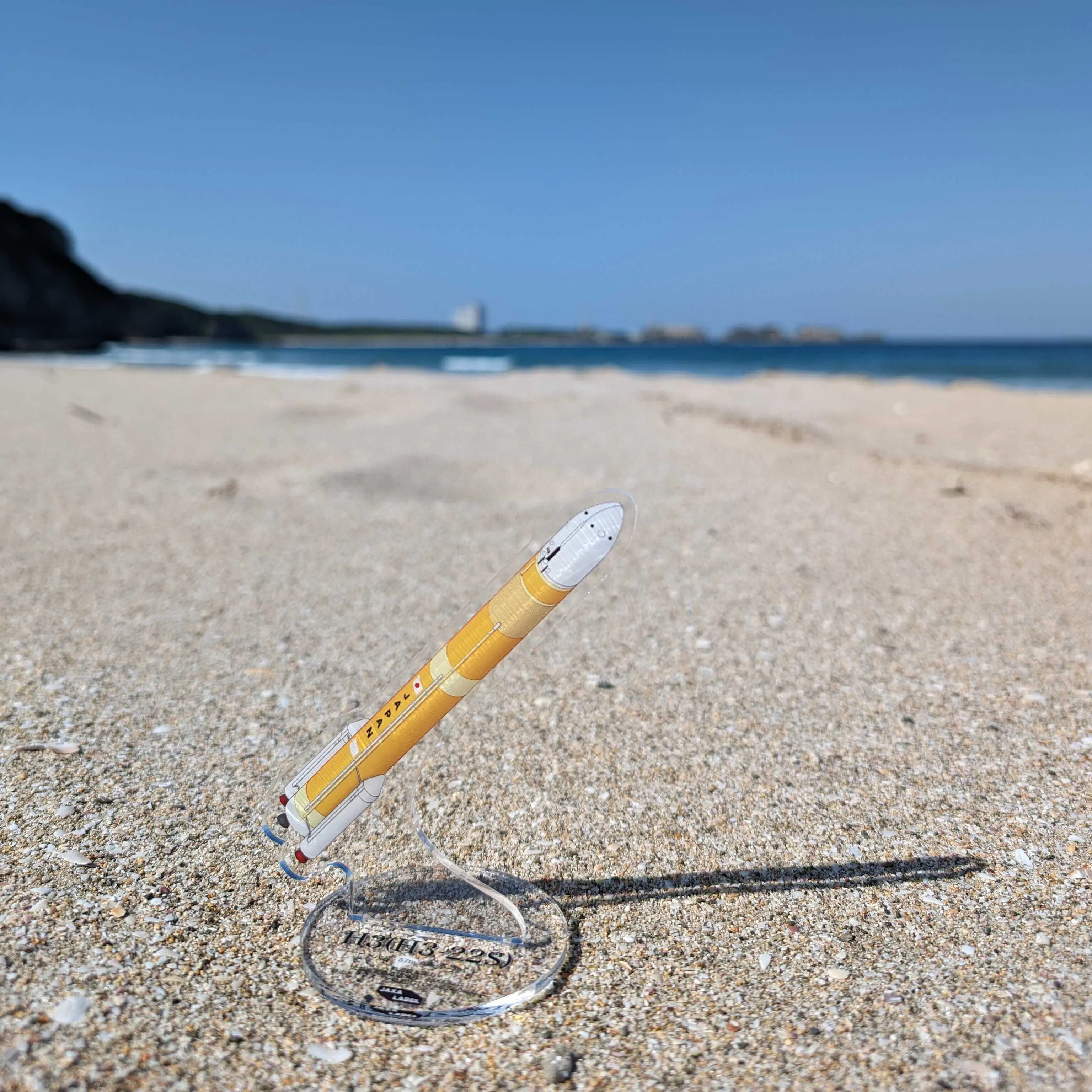 遠くに見えるのは…リアルH3ロケットが打ち上る種子島の射場です。6月30日に、H3ロケット3号機の打上が予定されていますが、もし現地に打上を見に行かれた際には、このような感じで、現地に打上を見に行った、応援してきた!という記念の写真をロケットアクスタと撮影するこができます。