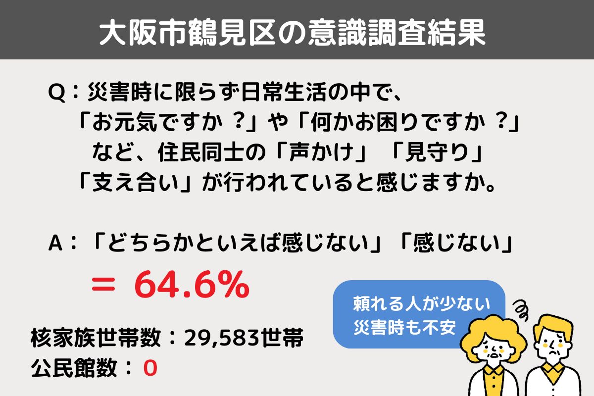 「つながり・交流」は、地震・災害などの非常時にも必要不可欠であり、命を守りあうことができるものにもなります。しかし、令和4年度に鶴見区でおこなわれた「第1回鶴⾒区⺠アンケート報告書」によると・・・