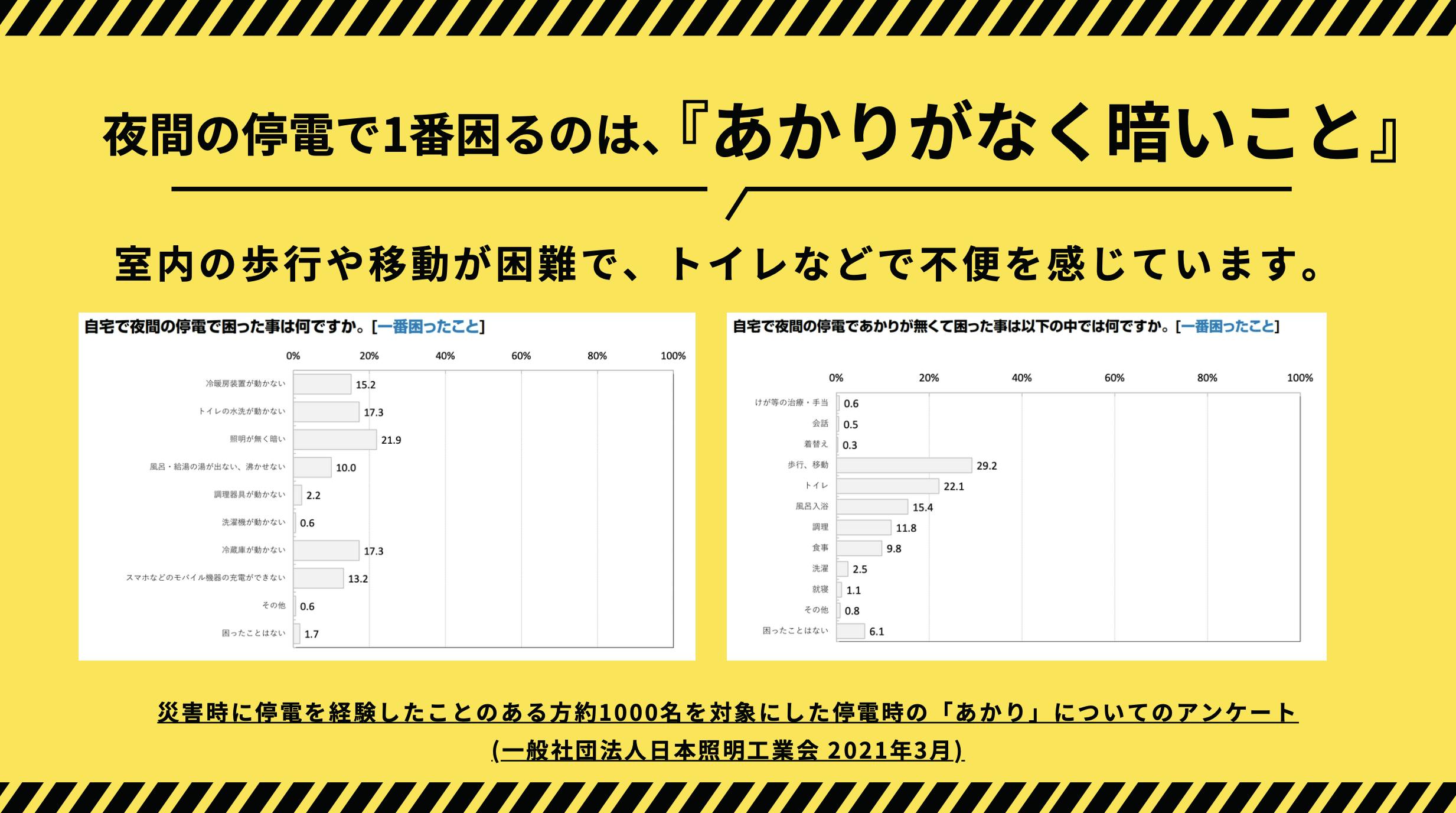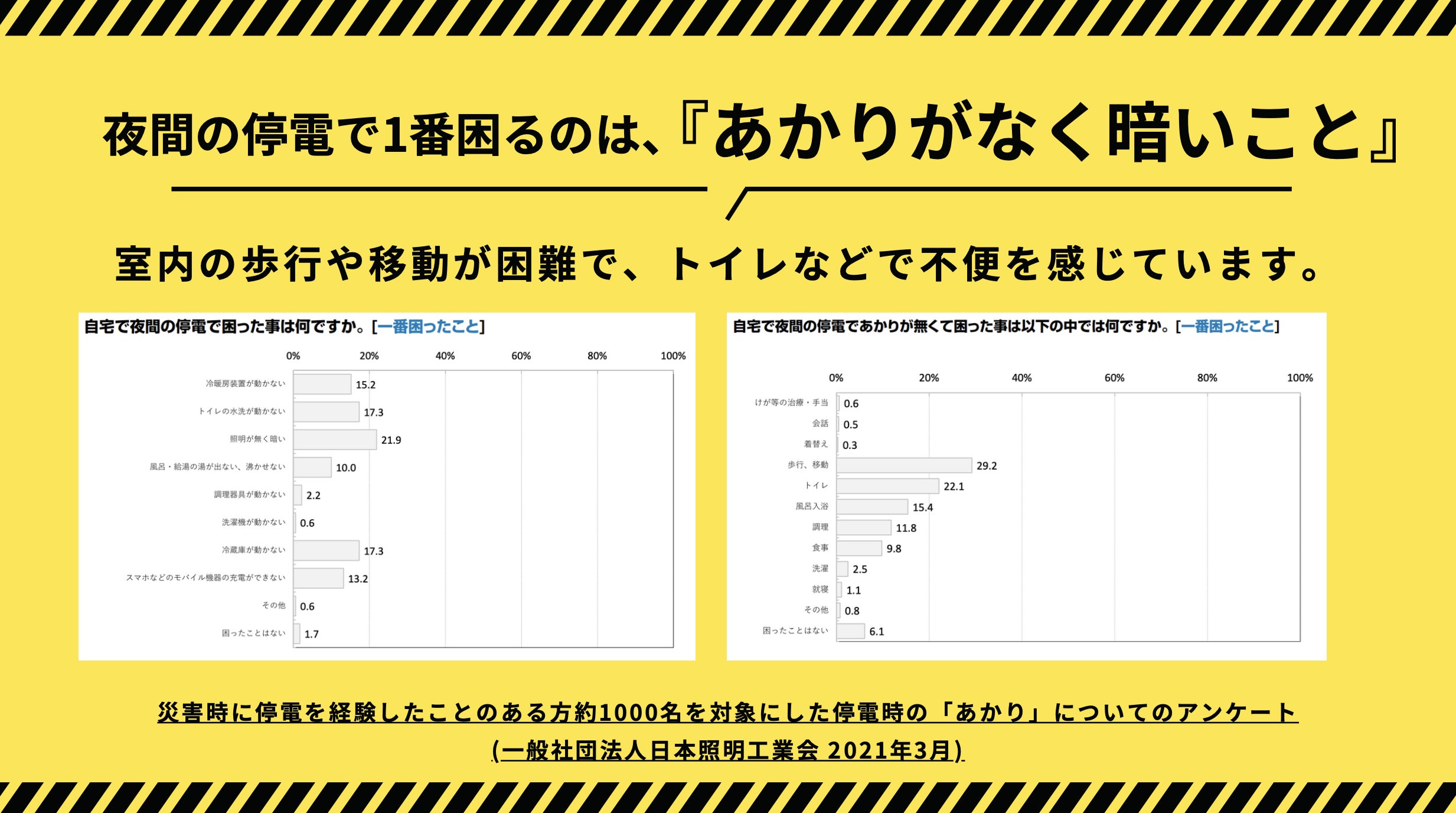 災害時における停電は、私たちの生活に大きな不安と不便をもたらします。特に夜間に停電が発生した場合、その影響は深刻です。一般社団法人日本照明工業会が実施したアンケートによれば、災害時の停電を経験した人々が夜間に最も困ったこととして挙げたのは、「明かりがなく暗いこと」でした。この結果は、明かりがないことが私たちにとってどれほど大きな問題であるかを示しています。