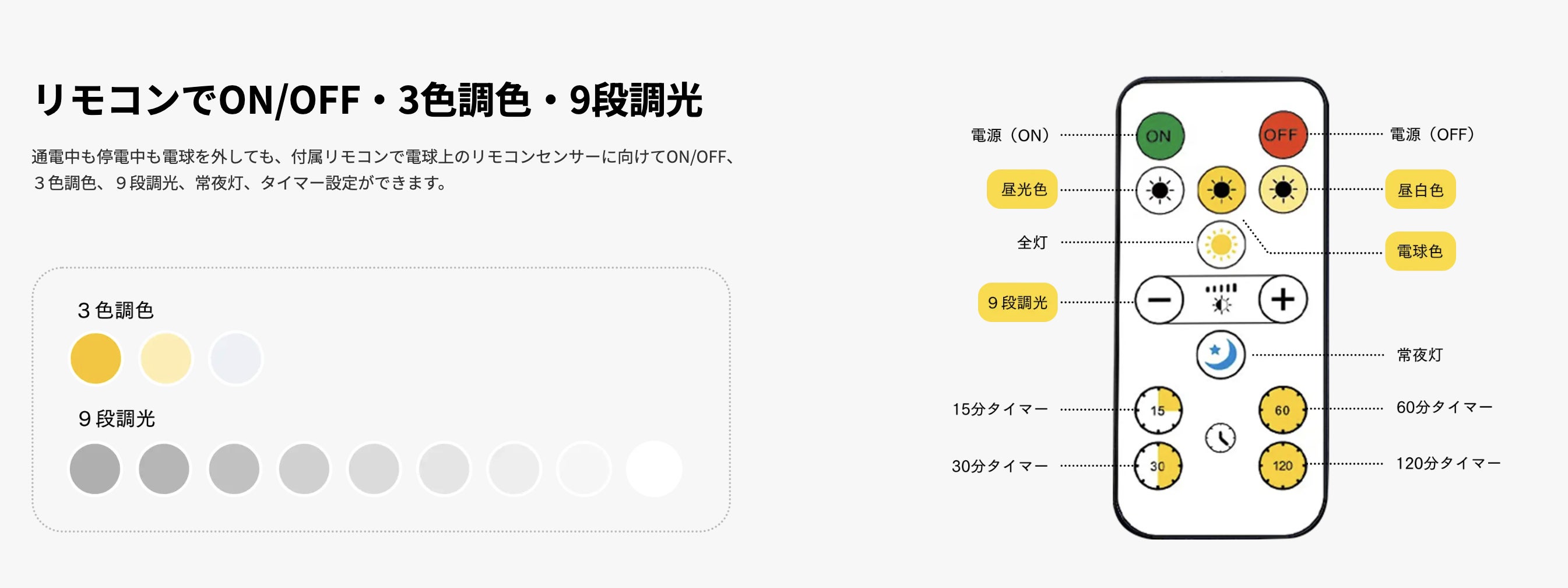 A:リモコンでは、照明のON/OFF、調光、タイマーなどを設定できます。