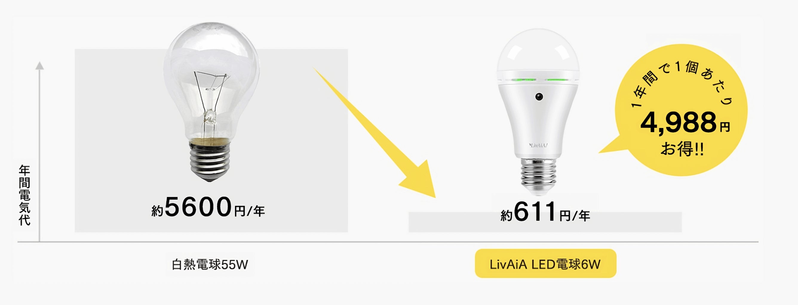 白熱球に比べ約1/8節電効果が見込めます。1年間で1個あたり4,988円もお得です。