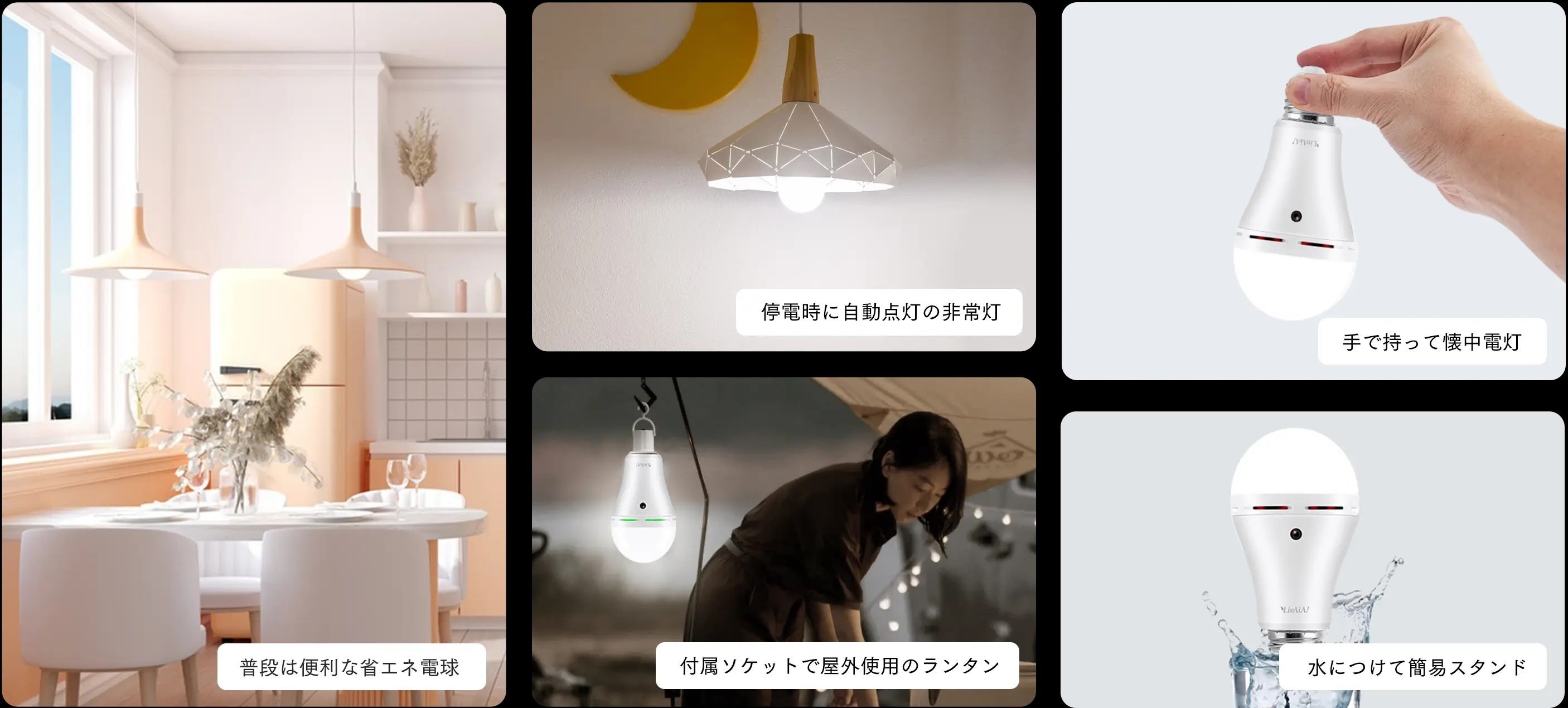 また、手に持ってや水につけて点灯させることも可能で、いざという時に役立つ電球です。