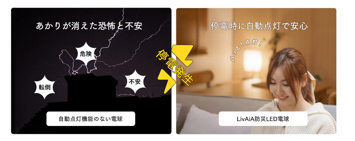 今回ご紹介する「LED防災電球」は、日常生活で使用する通常の照明としての機能に加え、停電時にも自動で点灯する優れた機能を持っています。日常生活では、音声操作で手軽に使える便利さを提供し、災害時にはいつも使い慣れた灯りがそのまま安心を提供してくれます。