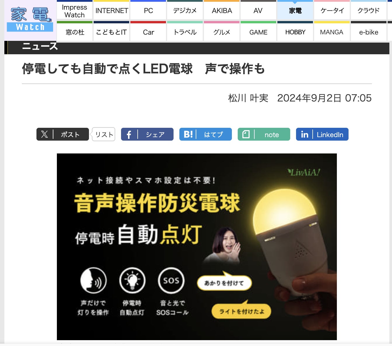 家電Watch 『停電しても自動で点くLED電球 声で操作も』