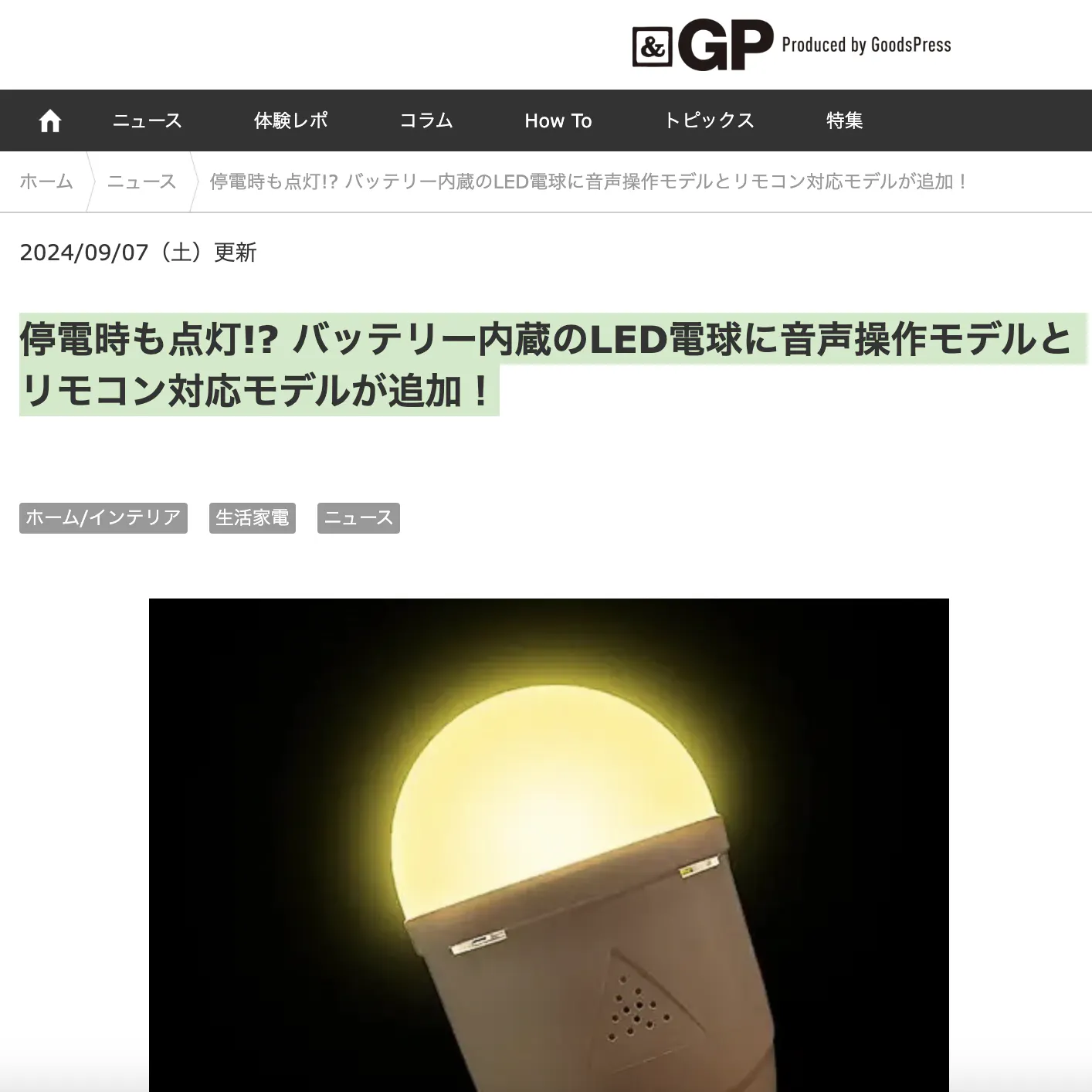 &GP (Goods Press) 『停電時も点灯!? バッテリー内蔵のLED電球に音声操作モデルとリモコン対応モデルが追加!』