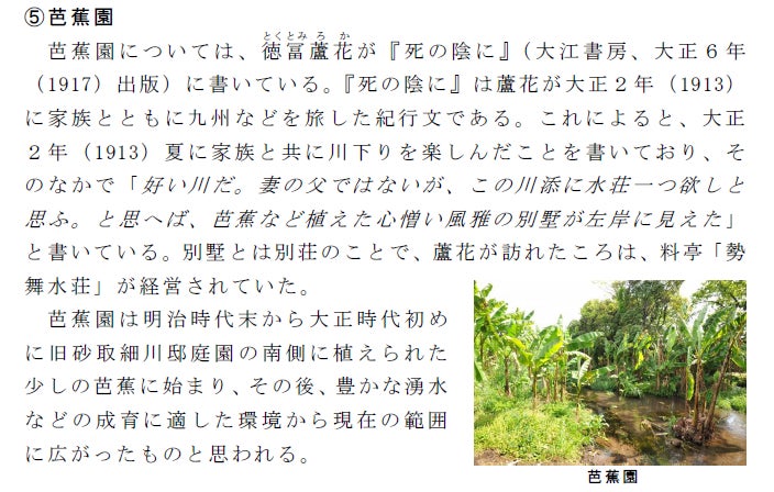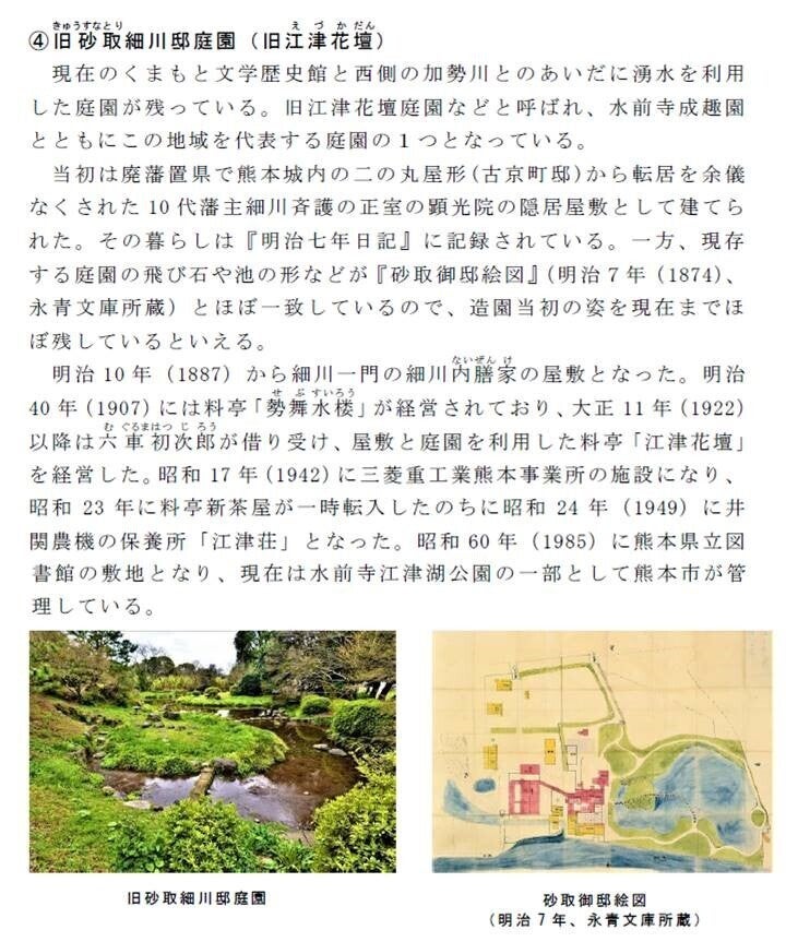 まず日本を代表する大名庭園の一つである《水前寺成趣園》につながる場所であり、同様の歴史を持つ 砂取細川庭園と芭蕉園は文化的価値が高く、近代作家、詩人の文学碑も多く建つところであり、熊本市民の憩いの場として親しまれている江津湖につながる場所でもあります。