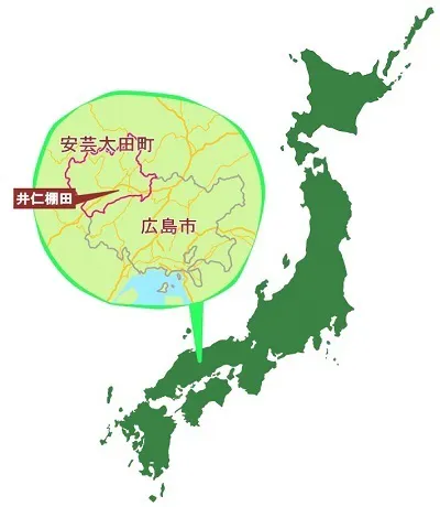 広島市の中心部から車で約1時間。井仁地区は標高450m~550mのすり鉢状の傾斜地にあります。「井」は丸い、「仁」は村や集落という意味があり、その名の通り集落が山に囲まれたのどかな地域です。