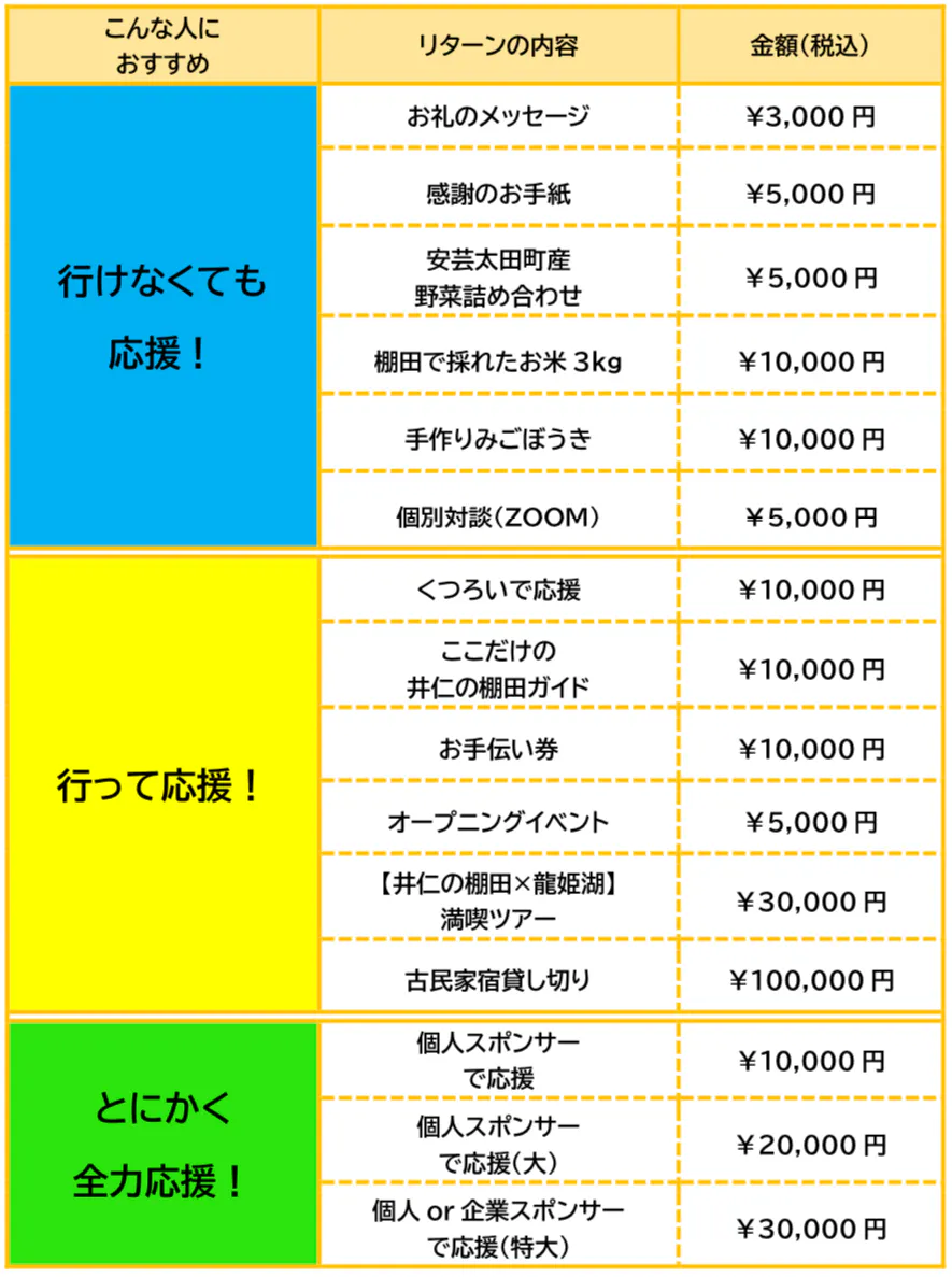 皆様に井仁の棚田の魅力を知ってもらえるようなリターンを用意しました。