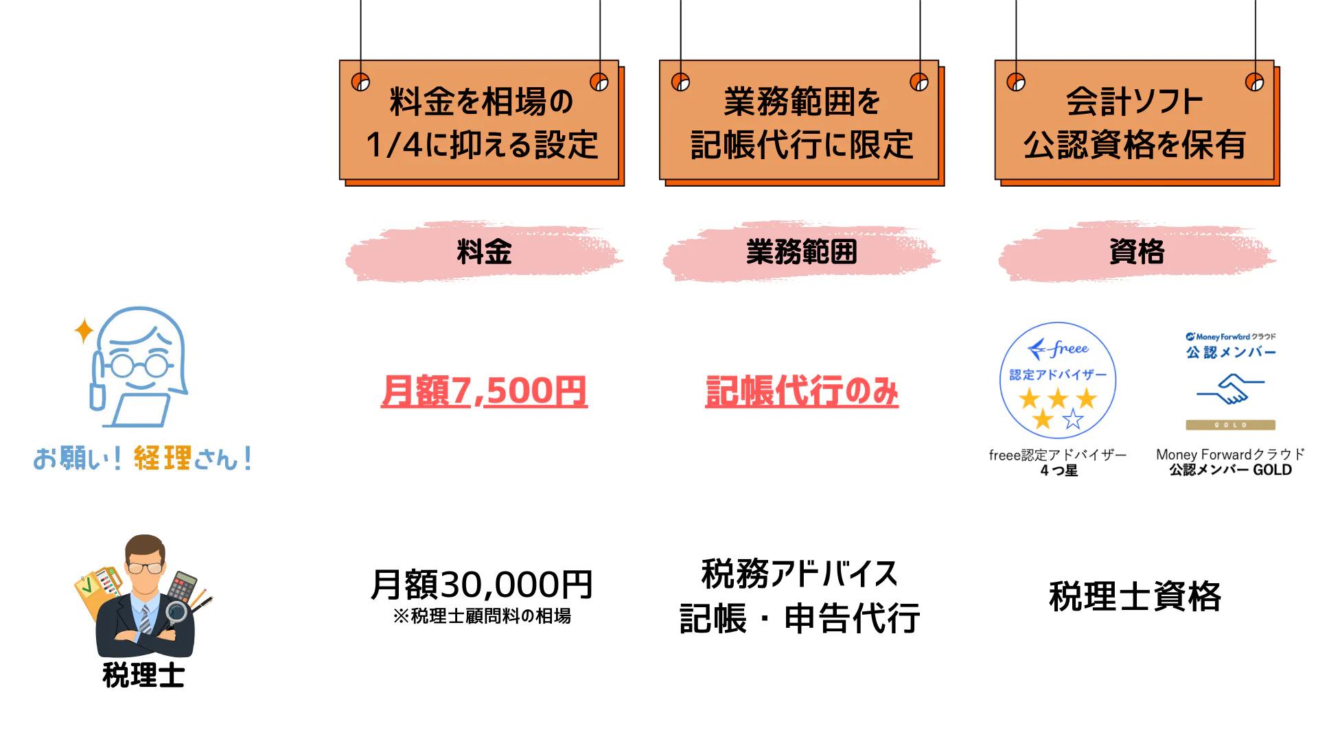 業務範囲を限定することで、価格は相場の1/4まで抑えながら、経営者が一番苦労している”記帳”の負担を減らします。