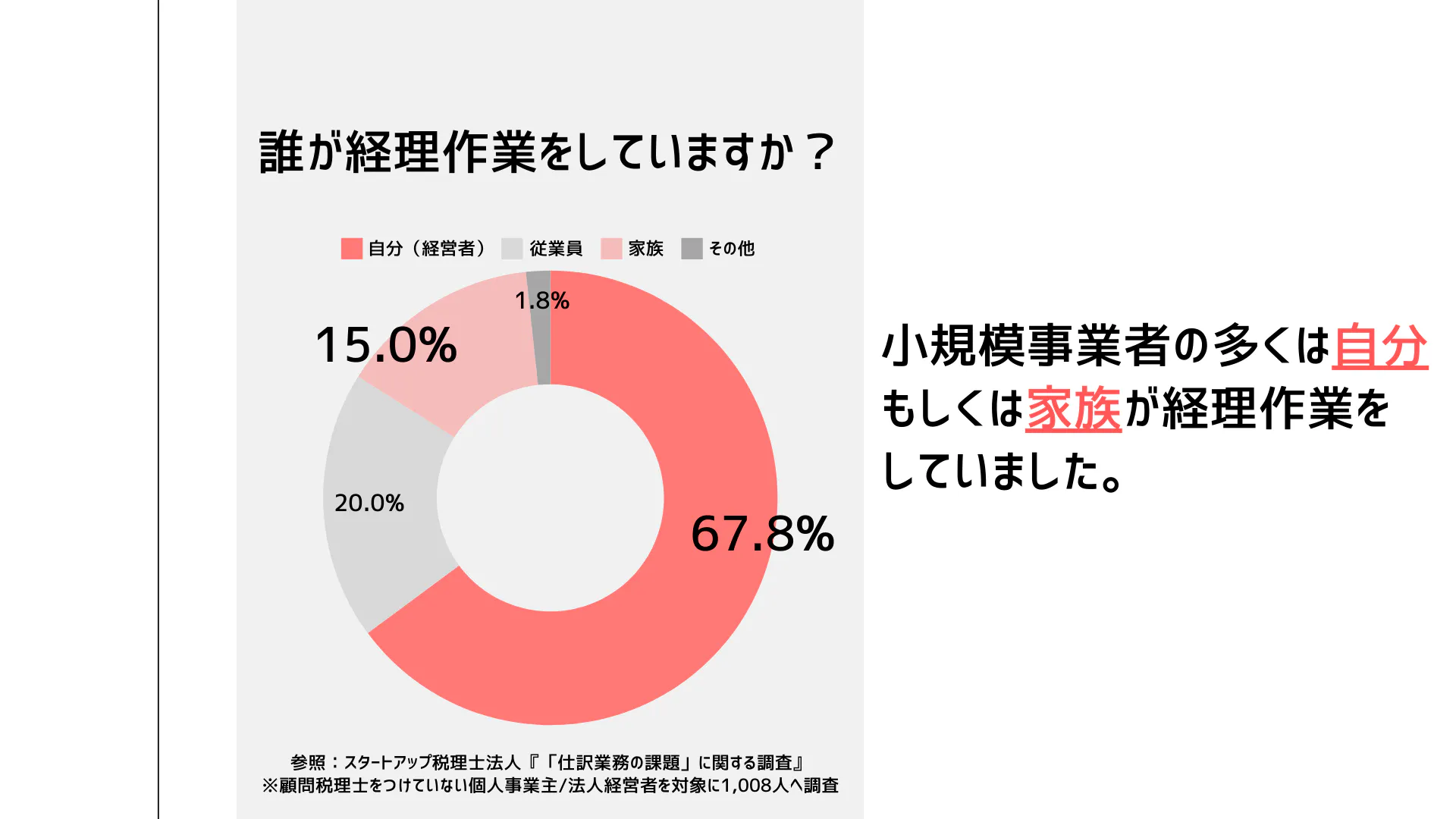 それにも関わらず、小規模事業者の多くは自分もしくは家族が経理作業をしています。