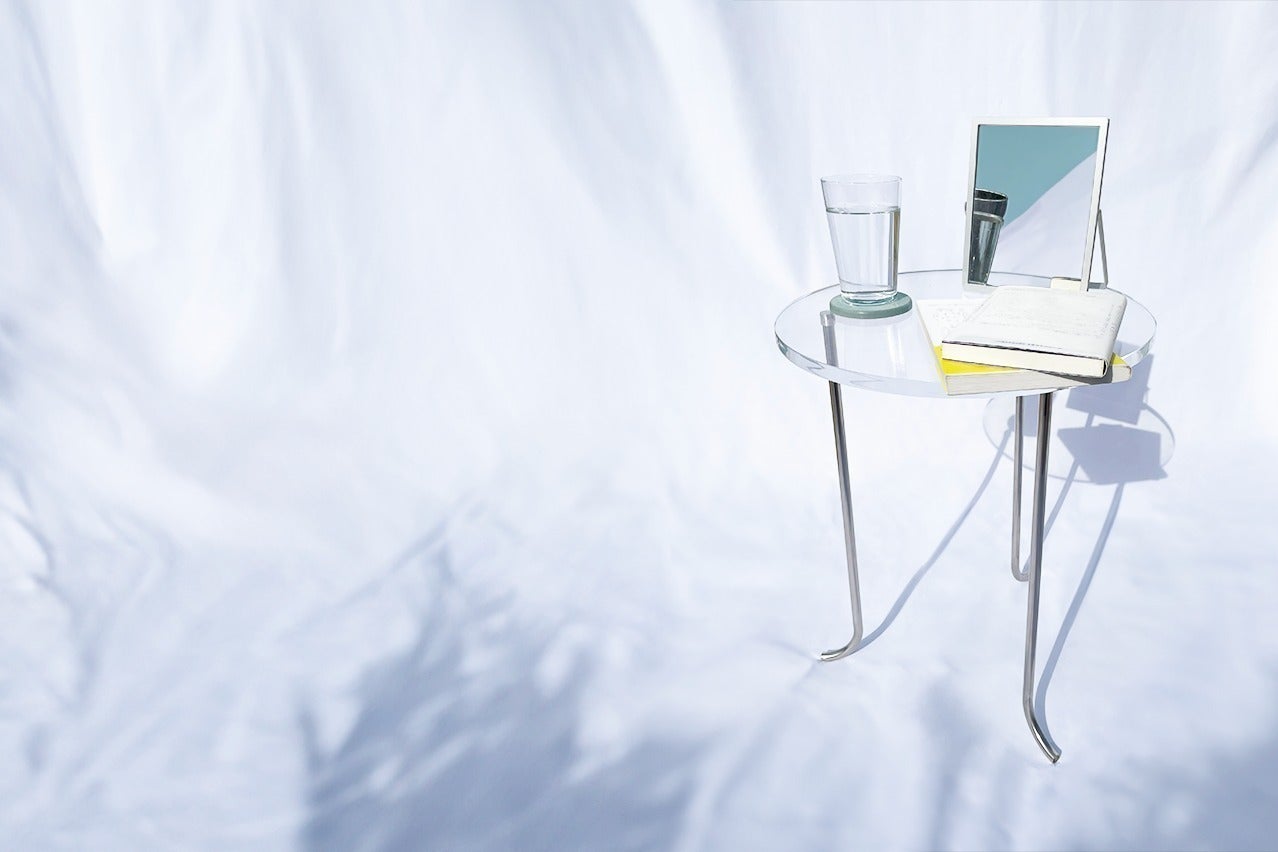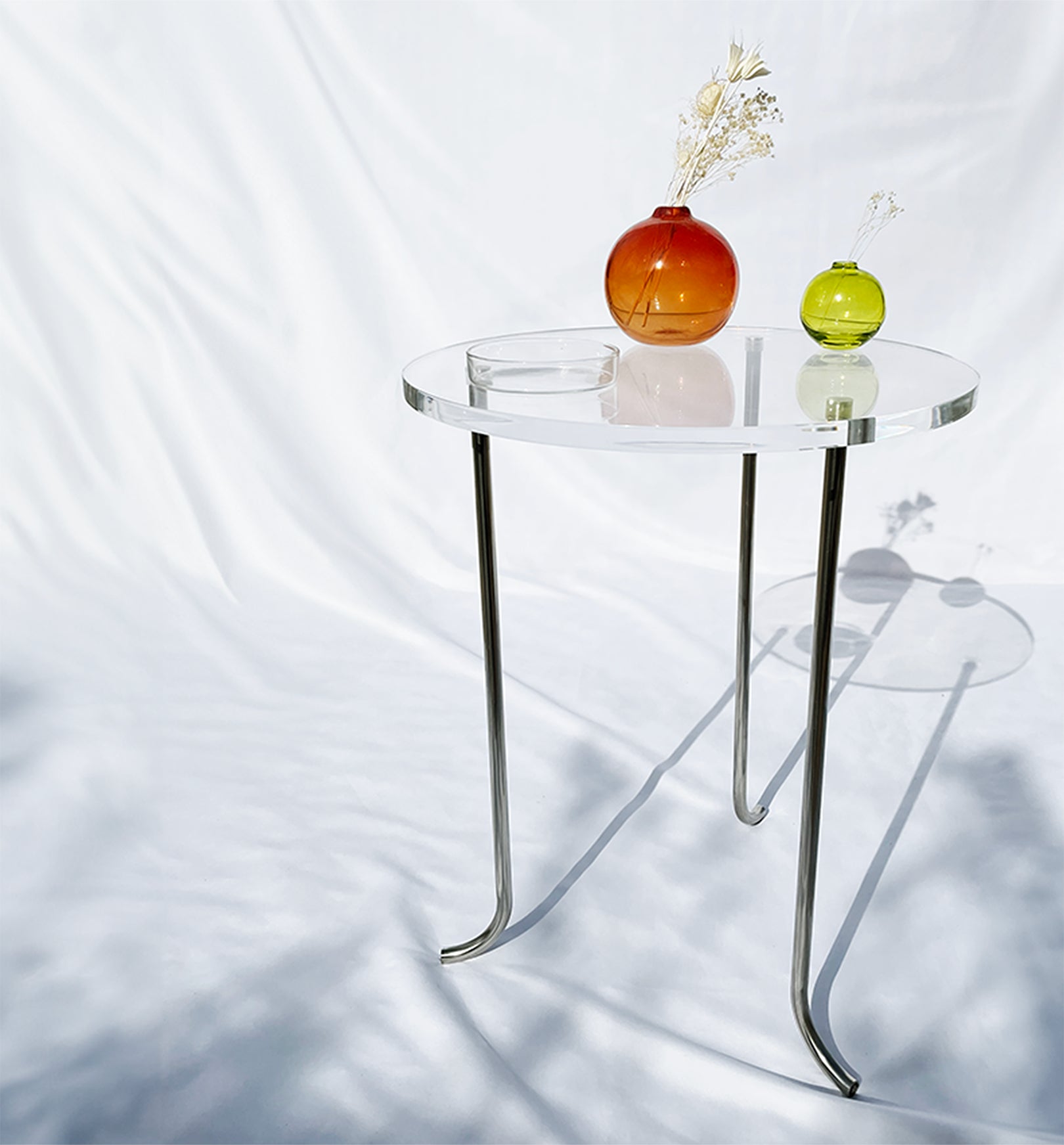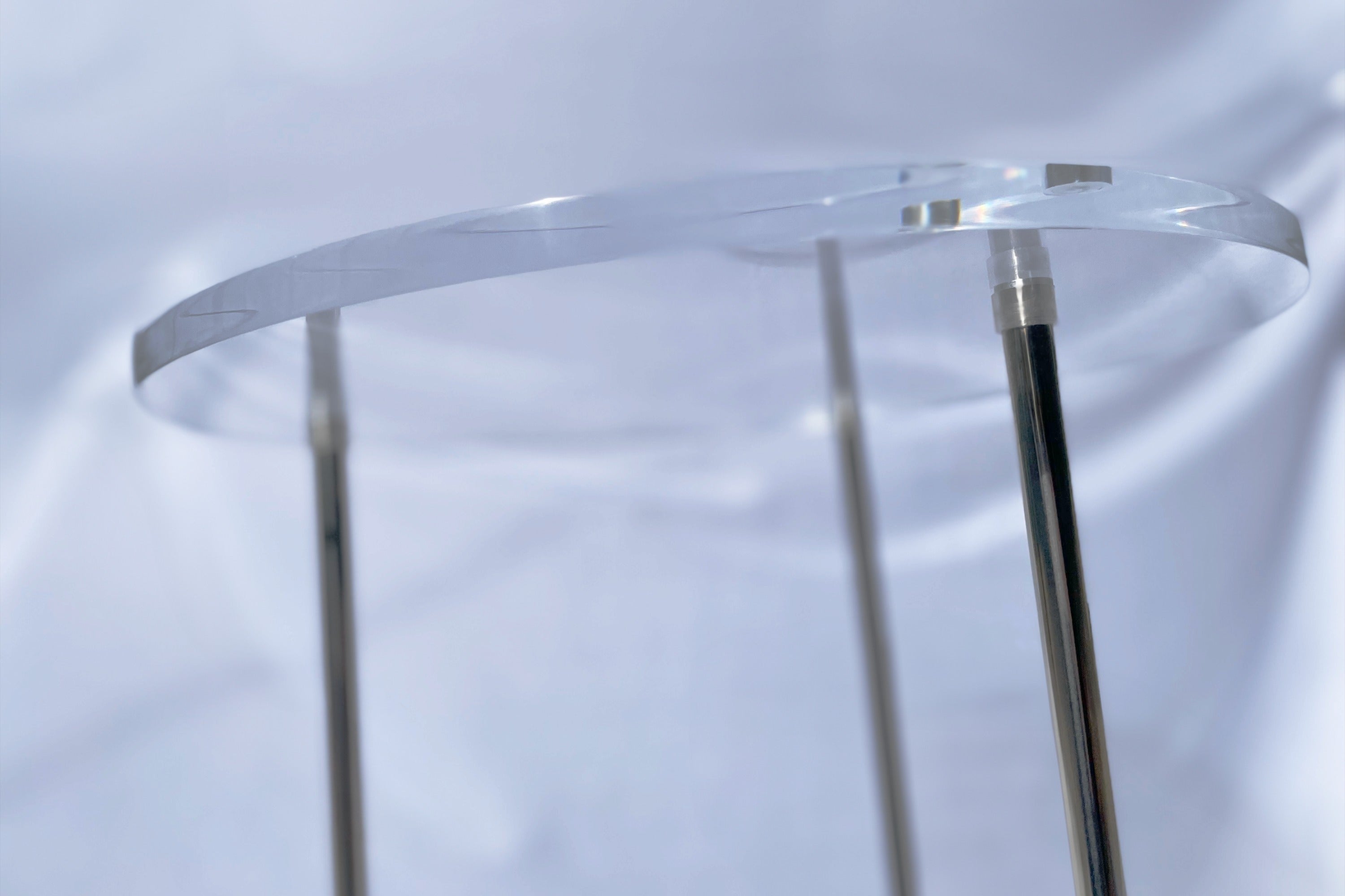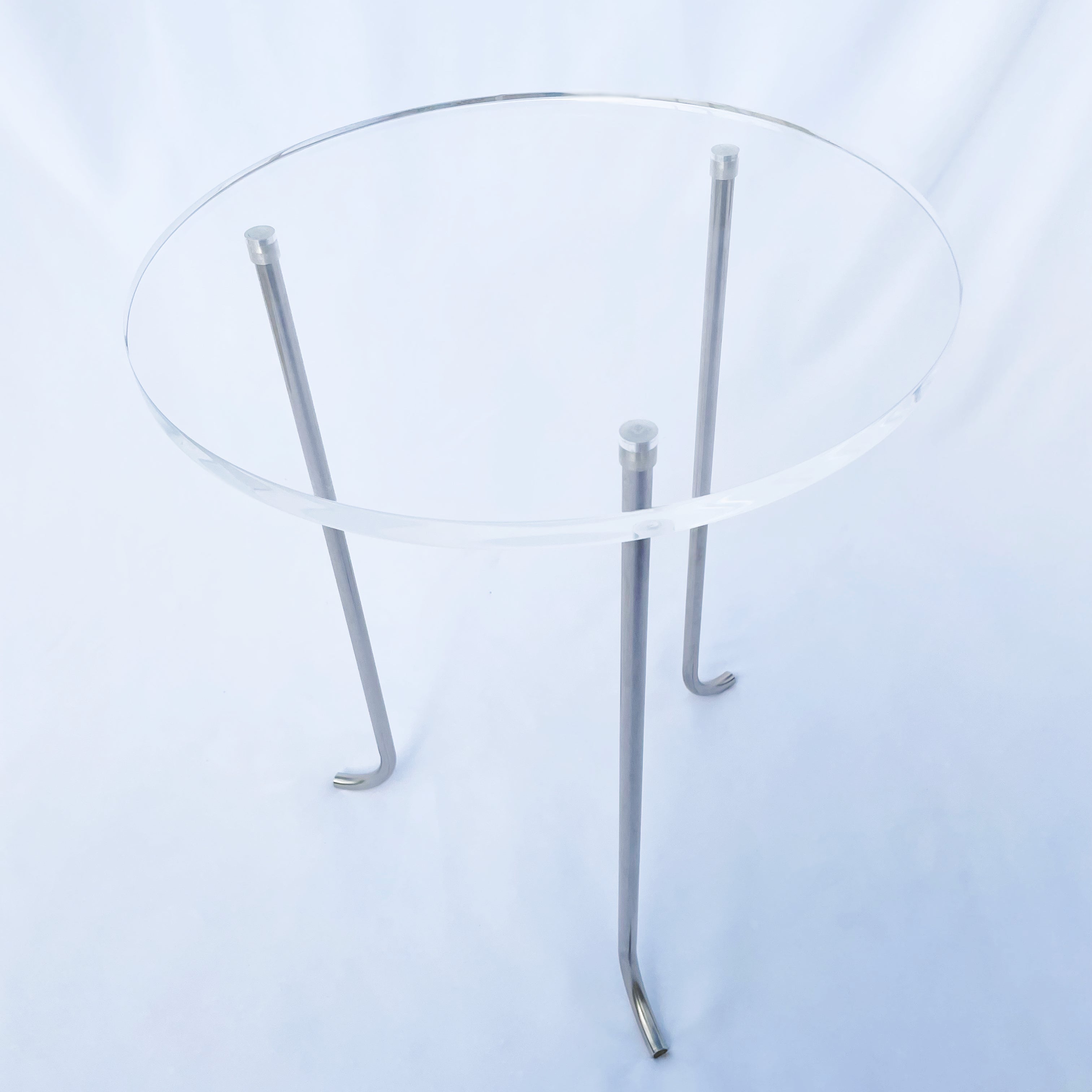 透明の天板とステンレスの脚の組み合わせ