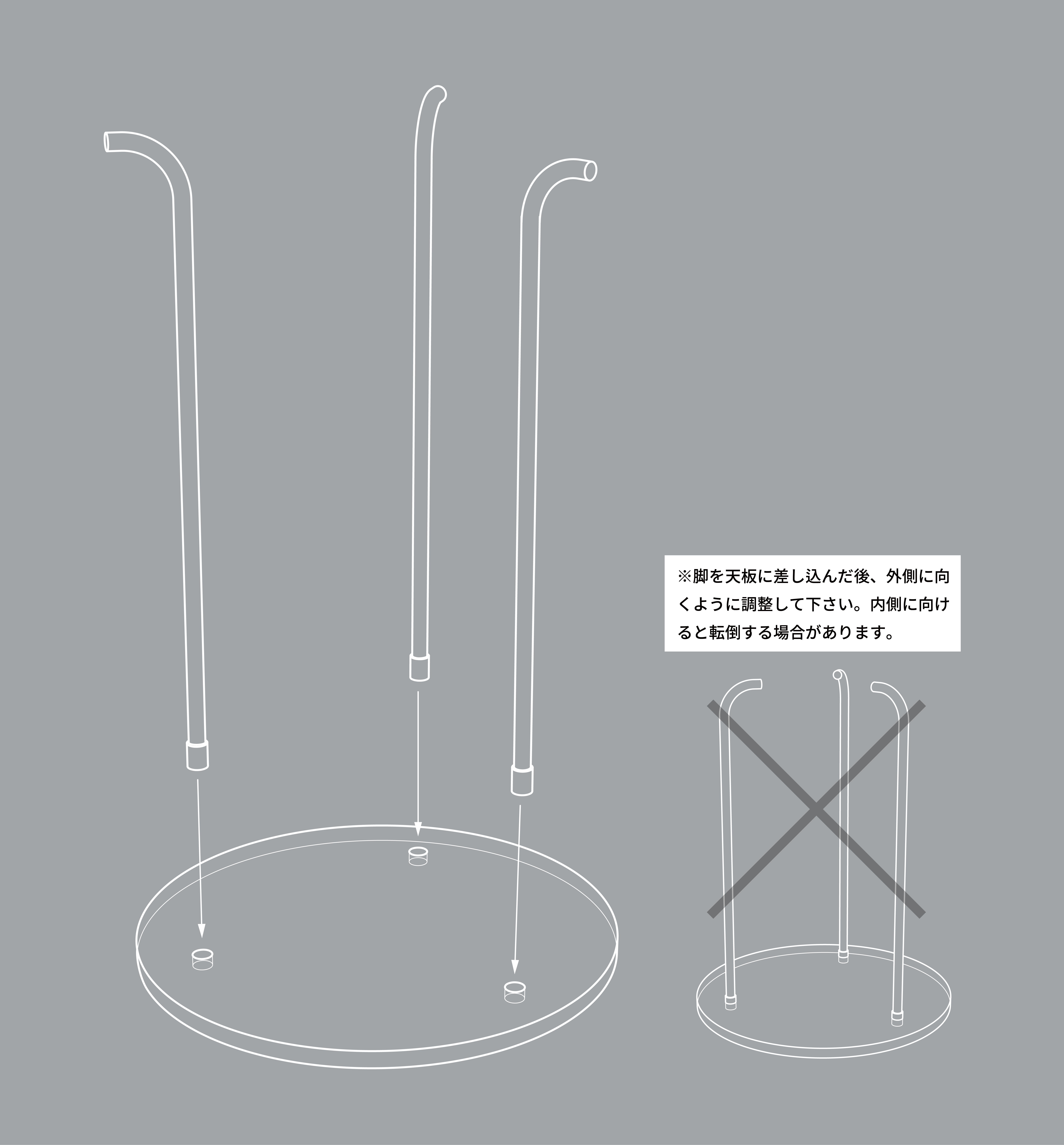 A:5分程で組み立て出来ます。天板に脚を3本差し込むだけで組立完了です。