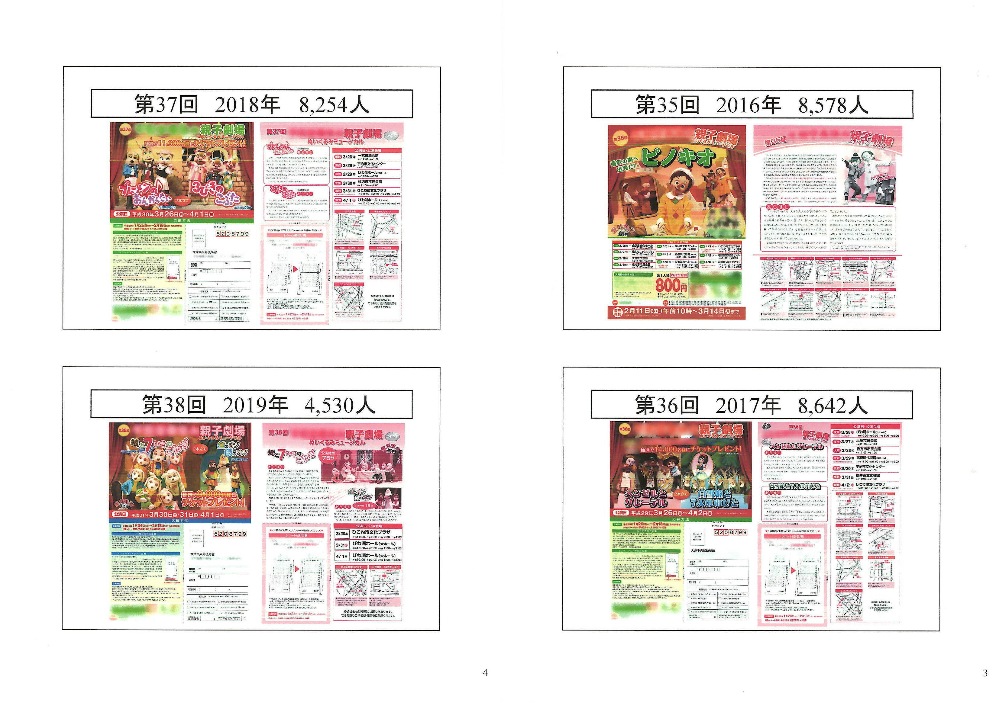 リターン⇒「○△ファミリー劇場」と名前冠、ネーミングライツ、入場券S席20枚×2回(午前+午後) お客様来場時配布パンフに告知、支援者提供の販促パンフ(A5サイズ以下)、支援者提供の販促粗品(5cm以内)などを袋にまとめて配布可能