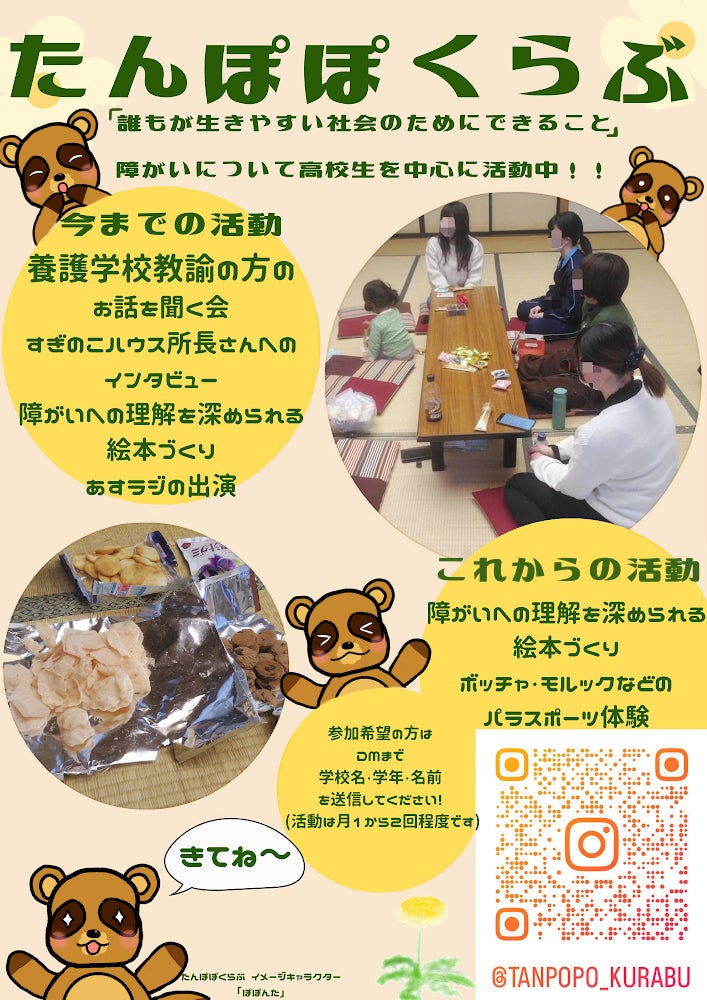 たんぽぽくらぶは、高校生が主体となり、障がいへの理解を深めるために2022年11月から活動を始めた団体です。
