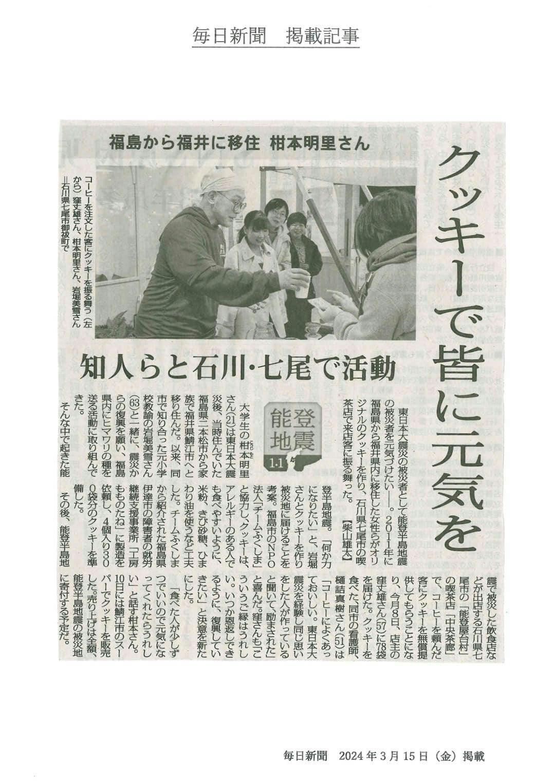 13年前の小学2年生の時に福島で被災された柑本(こうじもと)さんが、非難された福井県鯖江市から恩師である岩堀先生とお母様の3人で柑本さんが考案したクッキーを、福島県の授産施設で作ったものを先週僕が受け取った記事が掲載されました。週末出店しているコーヒーを注文してくださったお客様にプレゼントさせていただきました。とっても優しい味で、お客様からも大好評でした。実はこのご縁も、名古屋にいらっしゃる僕のご縁づくりの師である、志賀内泰弘さんから福島に住む半田真仁さんにつながり、福井県に住む岩堀先生につながるという、すごい距離のつながりから生まれたご縁です。こうやって世の中は繋がっているんだと感じています。