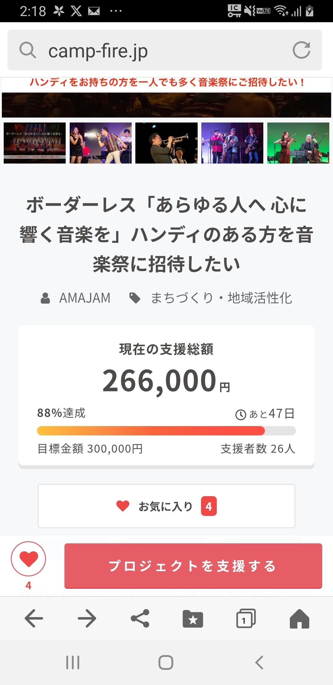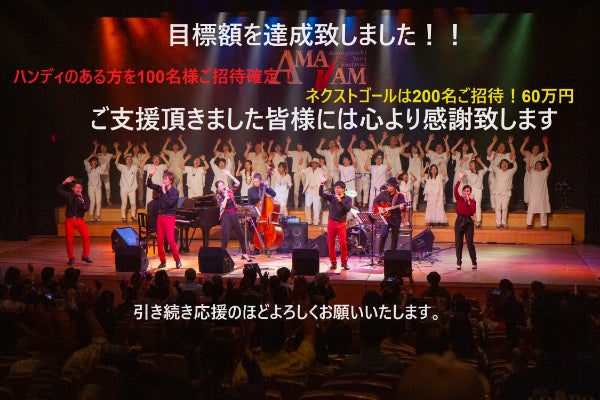 2024/03/19 12:19お蔭様で目標金額100%を達成することが出来ました。皆様、一人ひとりのご支援がこうしてひとつになりました。本当にありがとうございます。現時点ではハンディのある方などなにかしら事情を抱えている方100名様をご招待できます。まだ、残り日数があります。1800名収容のホールです。ネクストゴールは200名のご招待で60万円です!このプロジェクトにご覧になった下さった方、あなたの力でもっと多くの人を招待させてください。すでにご支援頂いている方に厚かましいお願いですが、皆様のSNSなどでシェアして頂き、このプロジェクトを多くの方に知って頂けるようご協力をよろしくお願いいたします。あと27日!!ネクストゴールに向かって頑張ります!引き続き応援のほどよろしくお願いいたします。 もっと見る