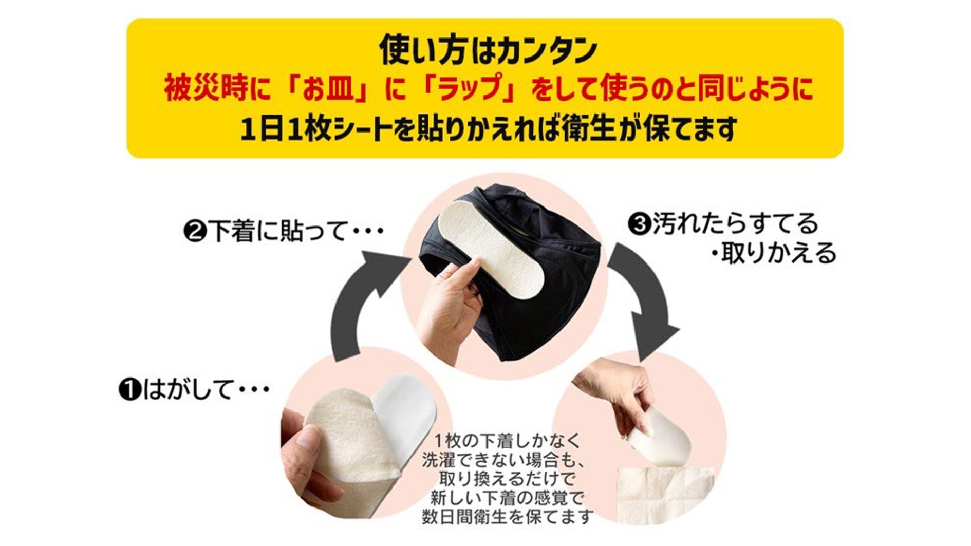 家族全員分の下着を長めの日数分備蓄しようと思うとかさばって難しいですよね。。。このシートを補助で使うことで下着の備蓄量を減らすことができ、もしもの時の安心につながるお手伝いが出来るかと思います。