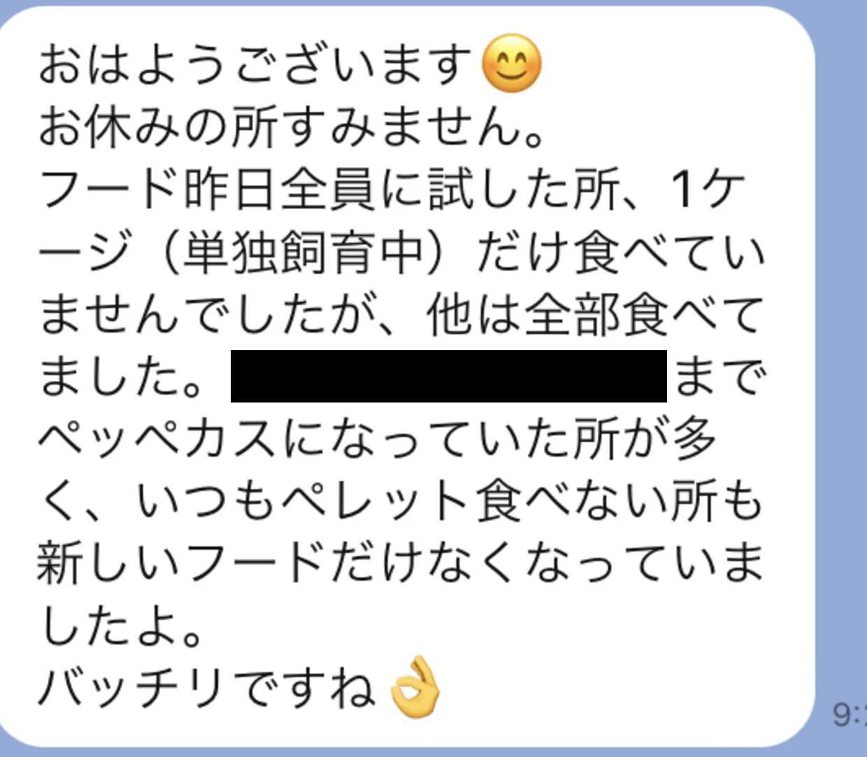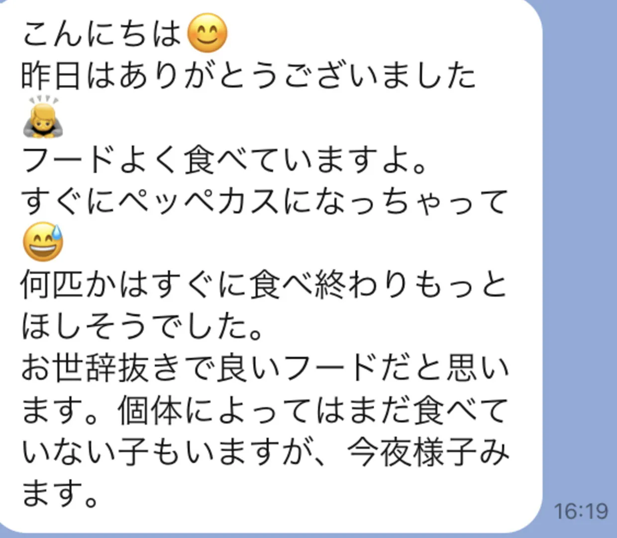 上記画像は、いつも与えているフードに私たちのオリジナルフードを振りかけて与えたとの事でした。