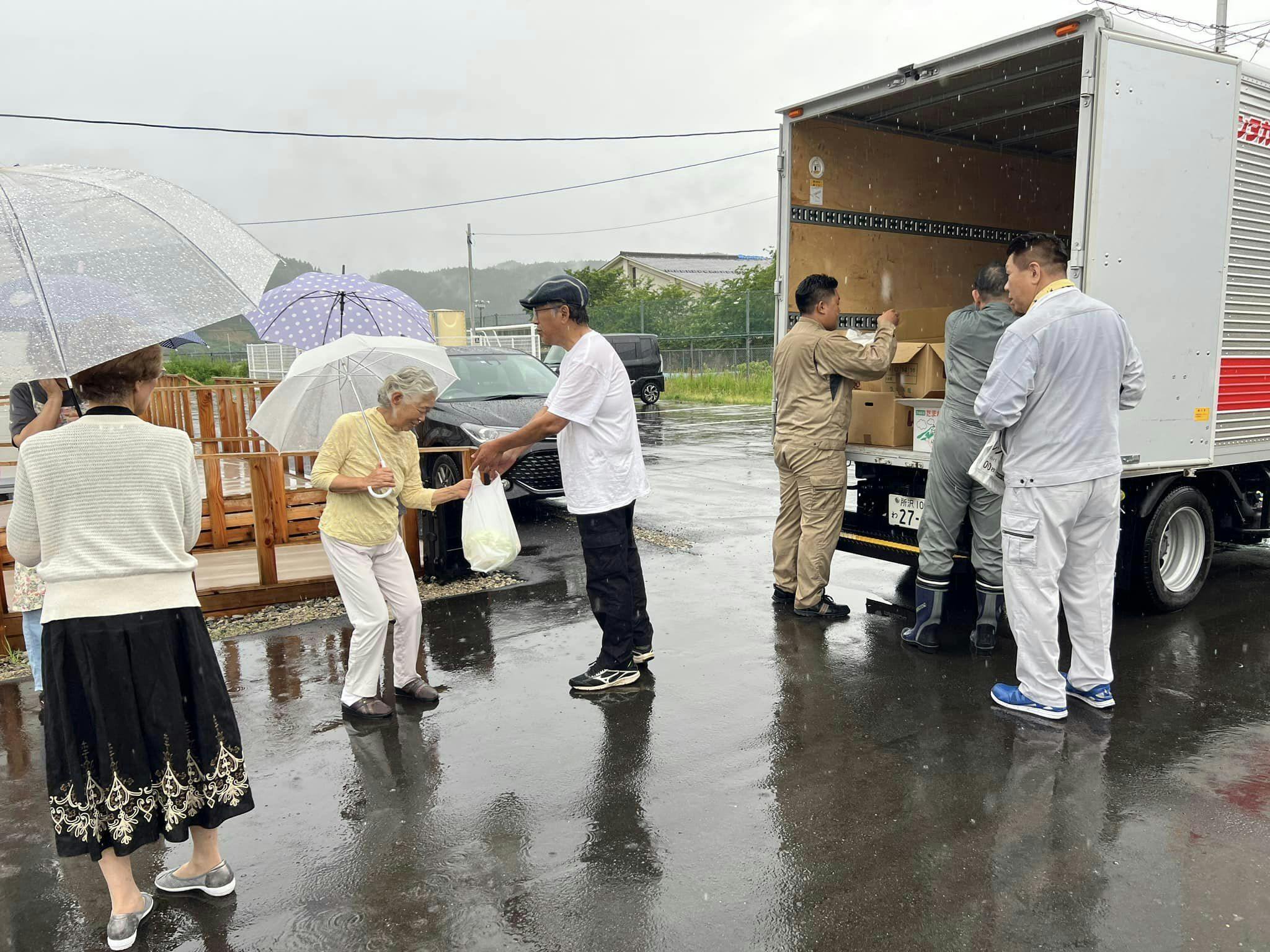 2024/07/30 11:21【内灘町、輪島市町野、能登町柳田 野菜支援】7.10関東から日の丸復興隊の支援がやって来てくれました。トラックに満載した、キャベツ、胡瓜、玉葱。まずは、西荒屋公民館へ(液状化甚大)次に輪島市町野へ(被災時孤立、今だに道に崩れた家有)時間がなくて南志見には行けなかった帰り時に柳残りを柳田へ預ける。明日、珠洲方面へ届ける予定。土砂降りの雨の中、ずぶ濡れになりながら5時間の移動と配布作業。小中学生に戻ったかのようなスイッチが入って楽しい厳しい環境の中も、皆に笑顔が広がる始めは、誰⁈という視線で話していた方々も濡れ鼠になりながら笑顔で野菜を一人一人に届ける隊員に笑顔溢れる駐在するボランティアの方々も、手伝ってくれる。真心の絆は自然に繋がります。こうやってできていくのが社会なんだなぁと教えられます。二十代の青年も働く。本物に逞しく育って欲しいと祈りつつ。金沢に帰った夜、雨に濡れながら2時間歩いて家に帰りました。帰宅は明け方4時。3時に通り過ぎた豆腐屋さんが仕込みをしていました。なかなかタフな一日でしたが、皆様のお力添えで、人生最後の日だったとしても悔いのない日になりました。 もっと見る公費解体できない内灘の家々
