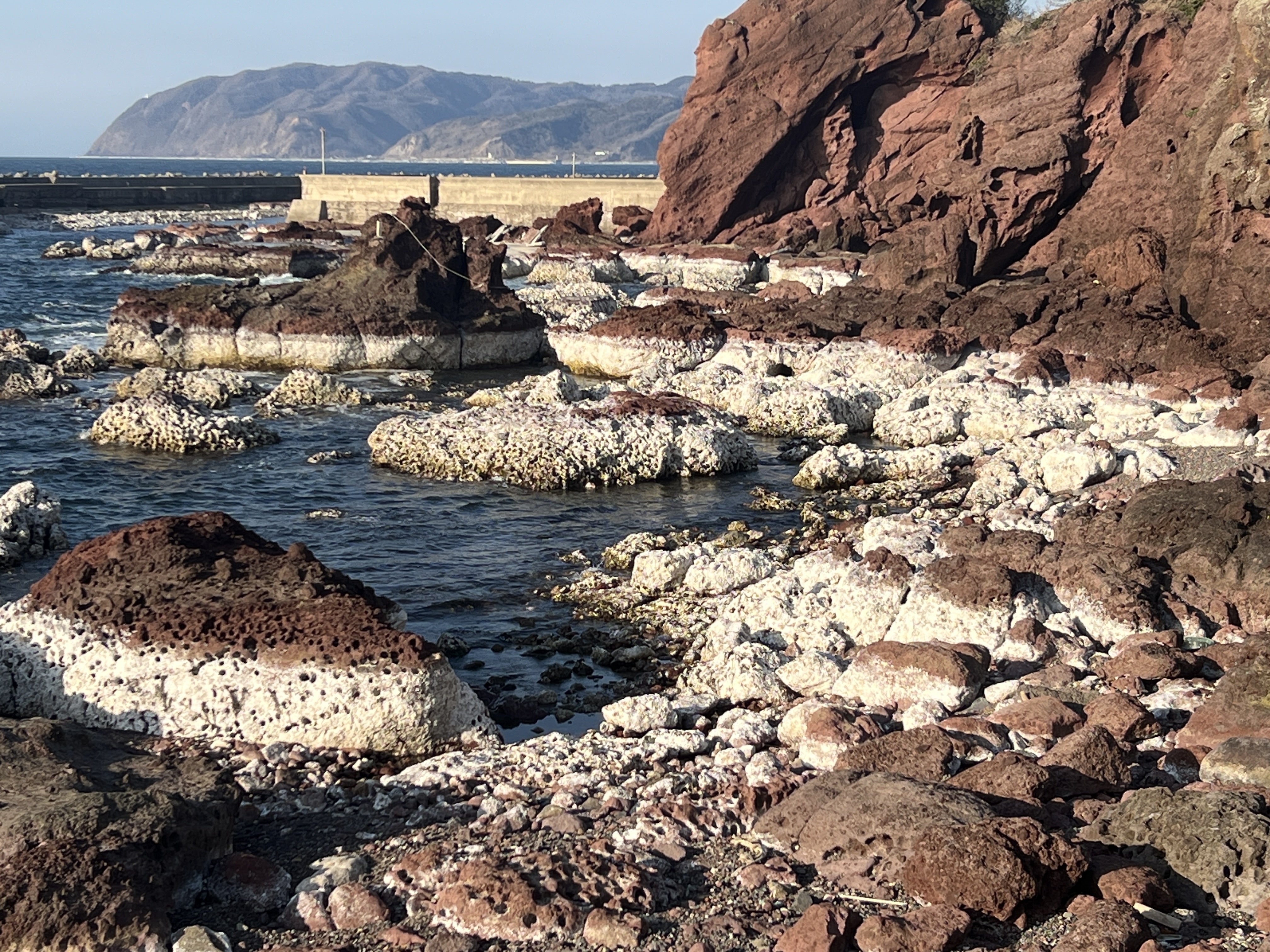 防波堤の向こうは、砂浜とゴツゴツとした岩場。