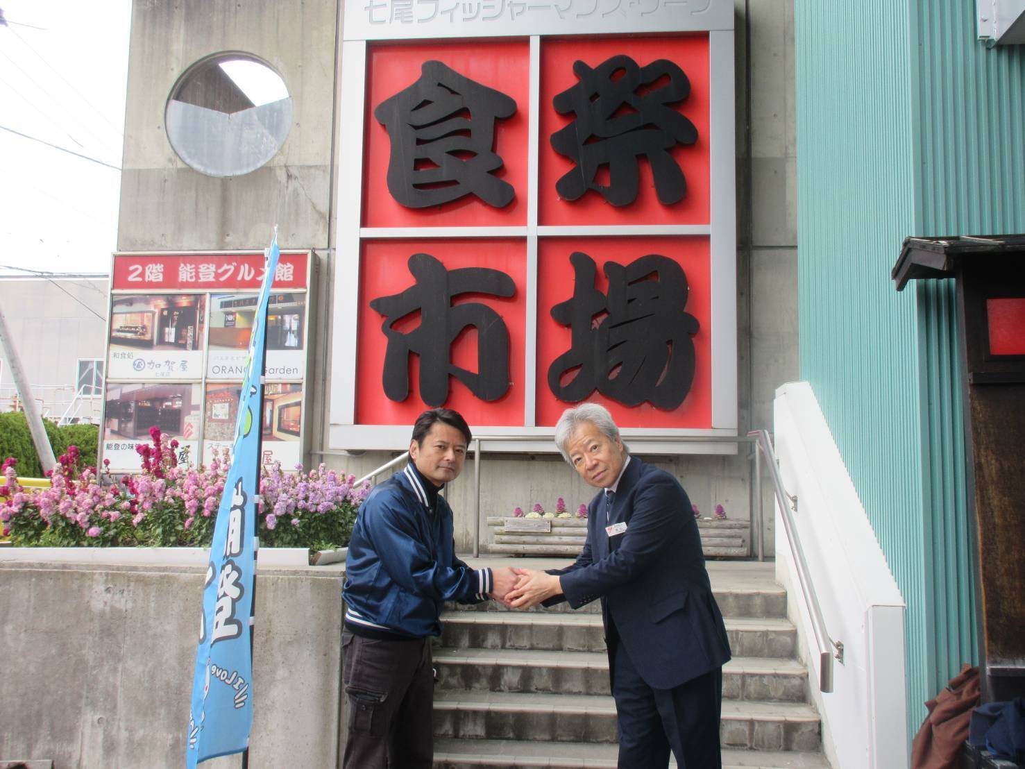 【能登食祭市場 村本駅長(左)読売旅行 貞広社長(右)】