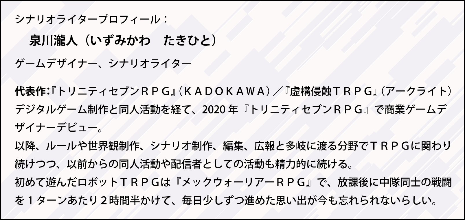 現在、執筆者に泉川瀧人さんをお迎えし、全3話のショートキャンペーンシナリオを制作中です。
