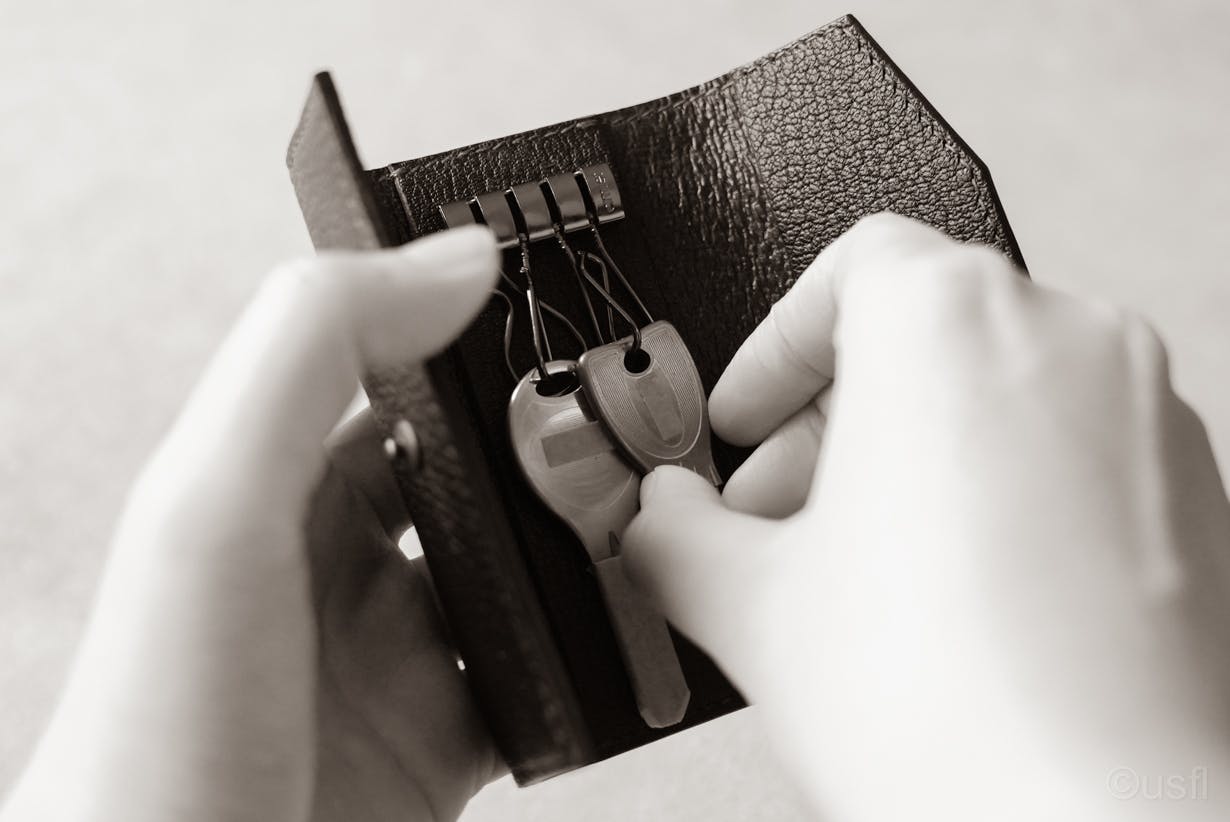 カギが4〜5本入るキーケースは、内側に「カギ4〜5本を収納できる空白スペース」が必要です。このスペースはカギを収納していないときも確保され続けます。