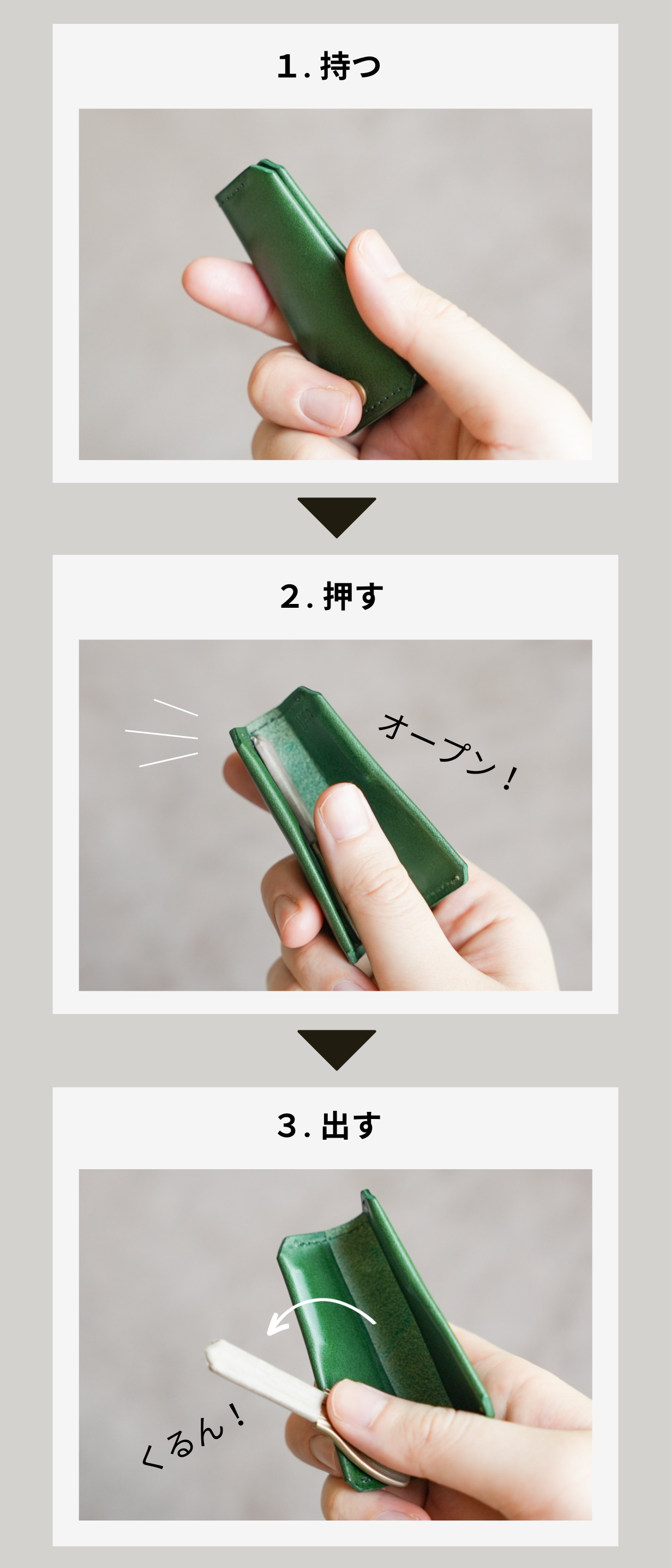 独自設計によりミニマム、かつシンプルな動作でカギを取り出せます。余計なアクションは存在しません。