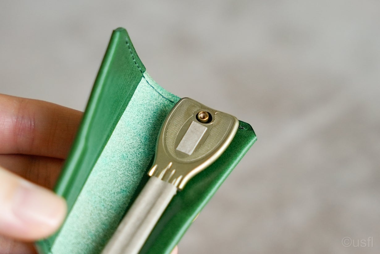カギが4〜5本入るキーケースは、内側に「カギ4〜5本を収納できる空白スペース」が必要です。このスペースはカギを収納していないときも確保され続けます。