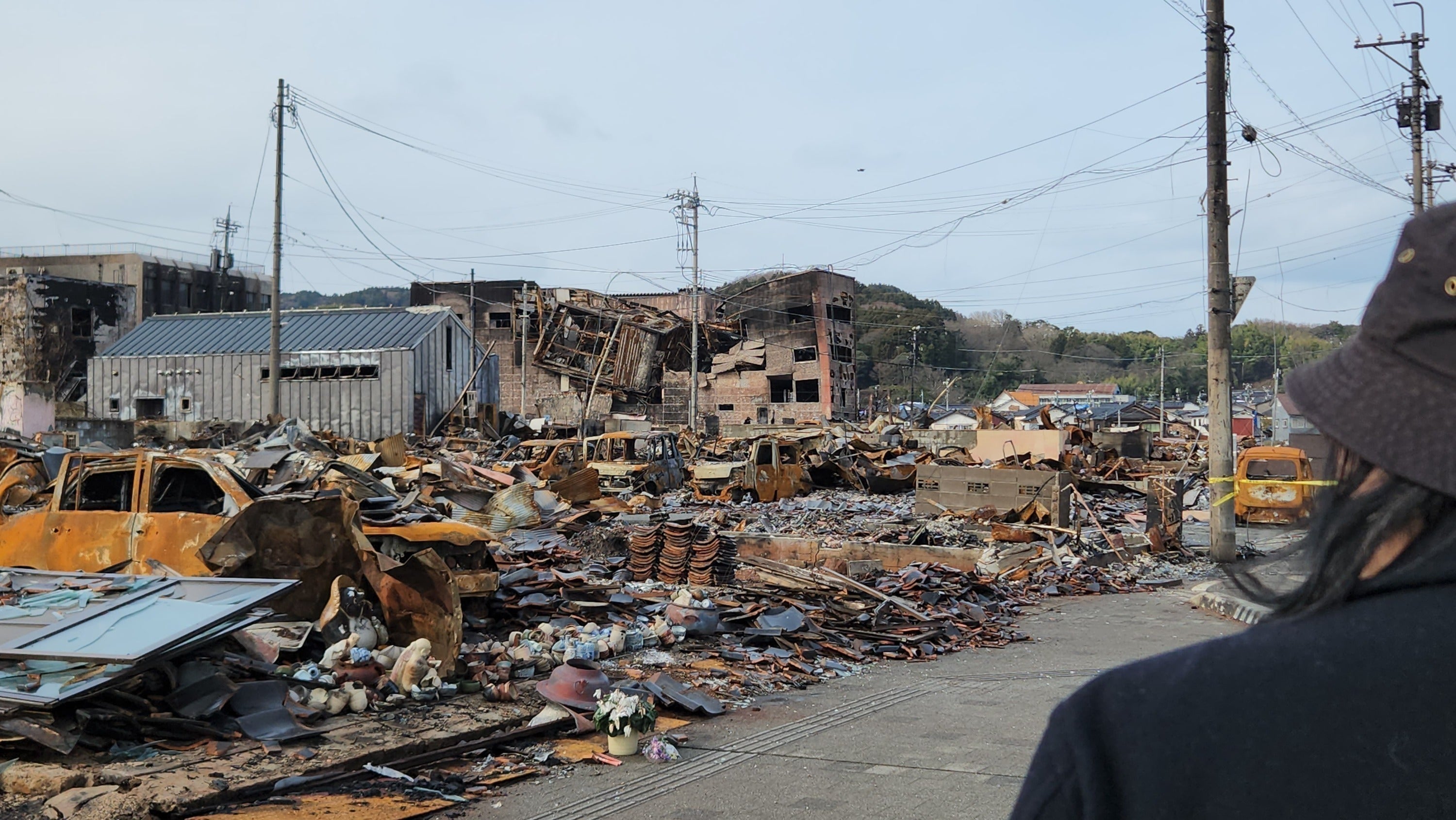 焼け跡におかれた販売していたであろう陶器とその傍らに捧げられた花に心が痛んだ。