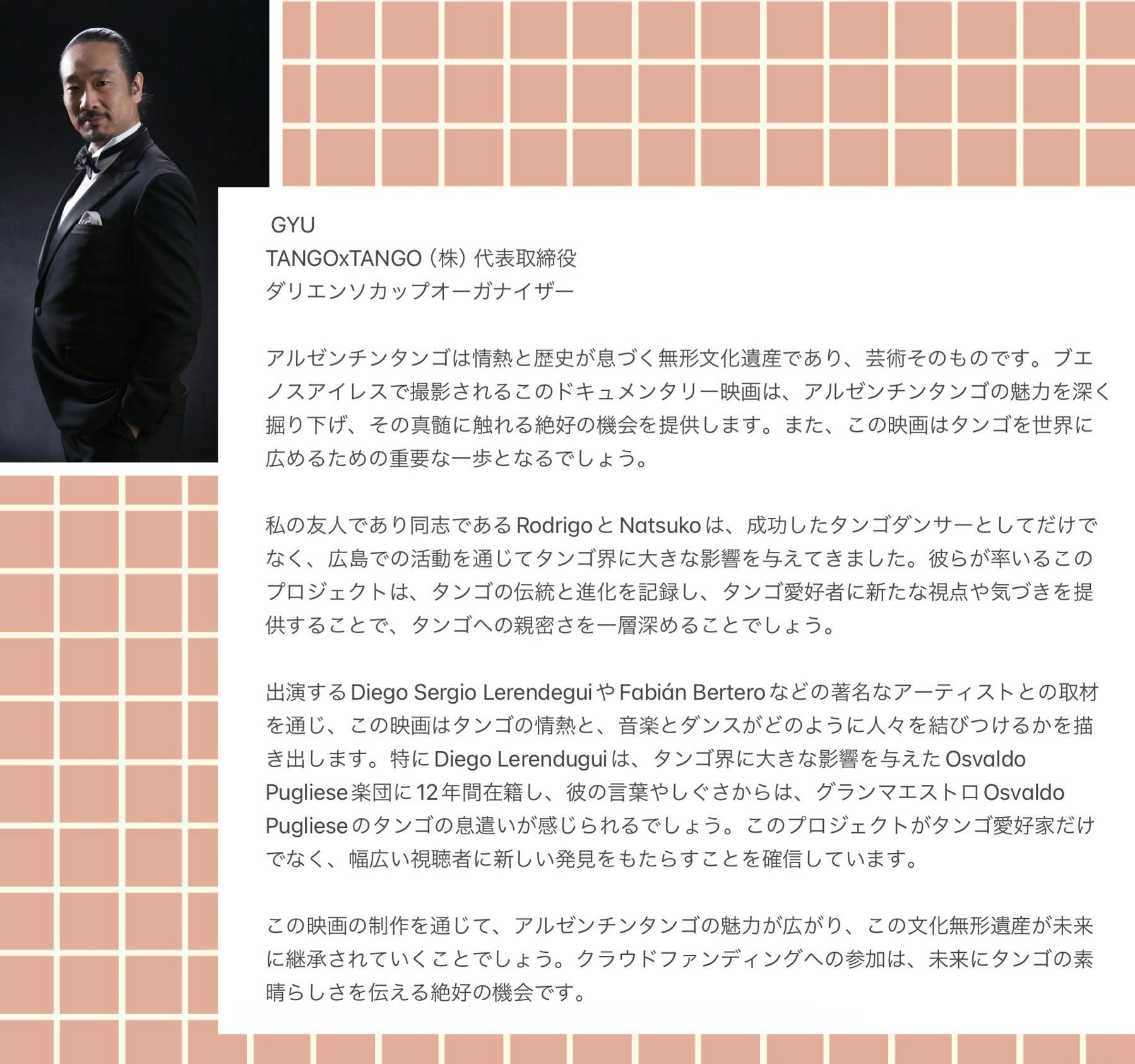 このクラウドファンディングプロジェクトは、私、RNプロダクションが主催しています。私は2003年から2007年までブエノスアイレスに留学をして、帰国後は長年にわたりタンゴ広める活動している講師&アーティストです。また近年、映像制作プロダクションも立ち上げ、アートを通じて人々の心に響くメッセージを伝えることに情熱を燃やしており、このドキュメンタリー番組を通じて、現地の魅力を世界に広めたいと考えています。