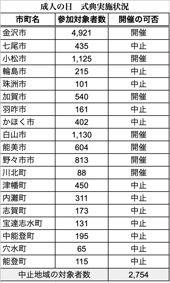 令和6年能登半島地震の被害が大きかった石川県内では、式典を中止を決めたのは七尾市、輪島市、珠洲市、羽咋市、かほく市、津幡町、内灘町、鹿町、宝達志水町、中能登町、穴水町、能登町の12市町。対象者合計は2,754名で、石川県全体の2割強に達する。