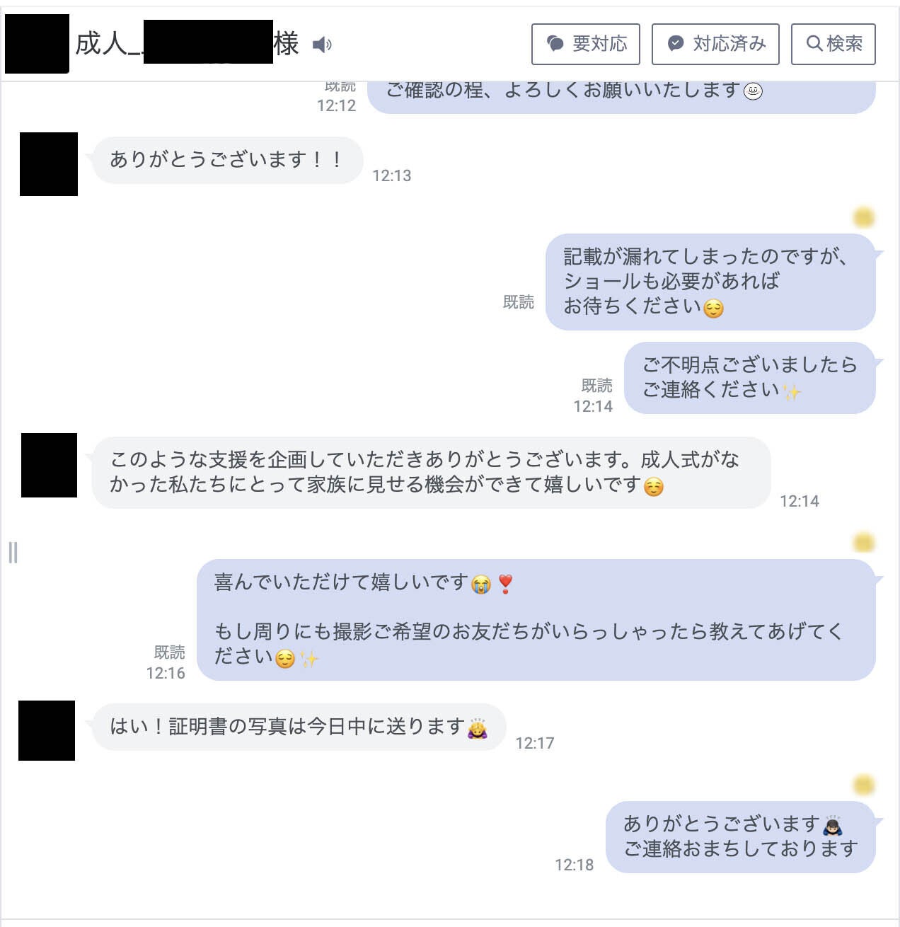 私たちが提供するのは被災地の二十歳の方々に無料で振袖・紋付袴の撮影を提供することです。震災の影響で成人式が中止になった彼らに、晴れやかな振袖姿や凛々しい紋付袴姿での記念写真を残してあげたいと思っています。