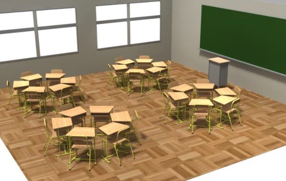 台形机のメリットを紹介します。 従来型の長方形の机から両サイドをカットしているため、教室がとても広く使えます。 今の長方形の机と長辺の長さは同じなので、使う部分はほとんど変わりません。 実際に生徒に座ってもらい、教科書やノートを置いてみましたが、落ちたりすることはありませんでした。 むしろ、居眠りをするスペースがなくなった という声も出ていました。笑 写真は、教卓から見た教室のCGです。 机間巡視が出来ないような狭い教室もあります。 現在、中学校は40人学級ですが、支援生徒は人数に含まないため、40数人詰め込んでいる教室も見られます。 そのような教室では、間を歩くことも出来ず、グループワークなどもってのほかです。 そのような悩みを抱えている教室にぜひ取り入れてもらいたいと思っています。