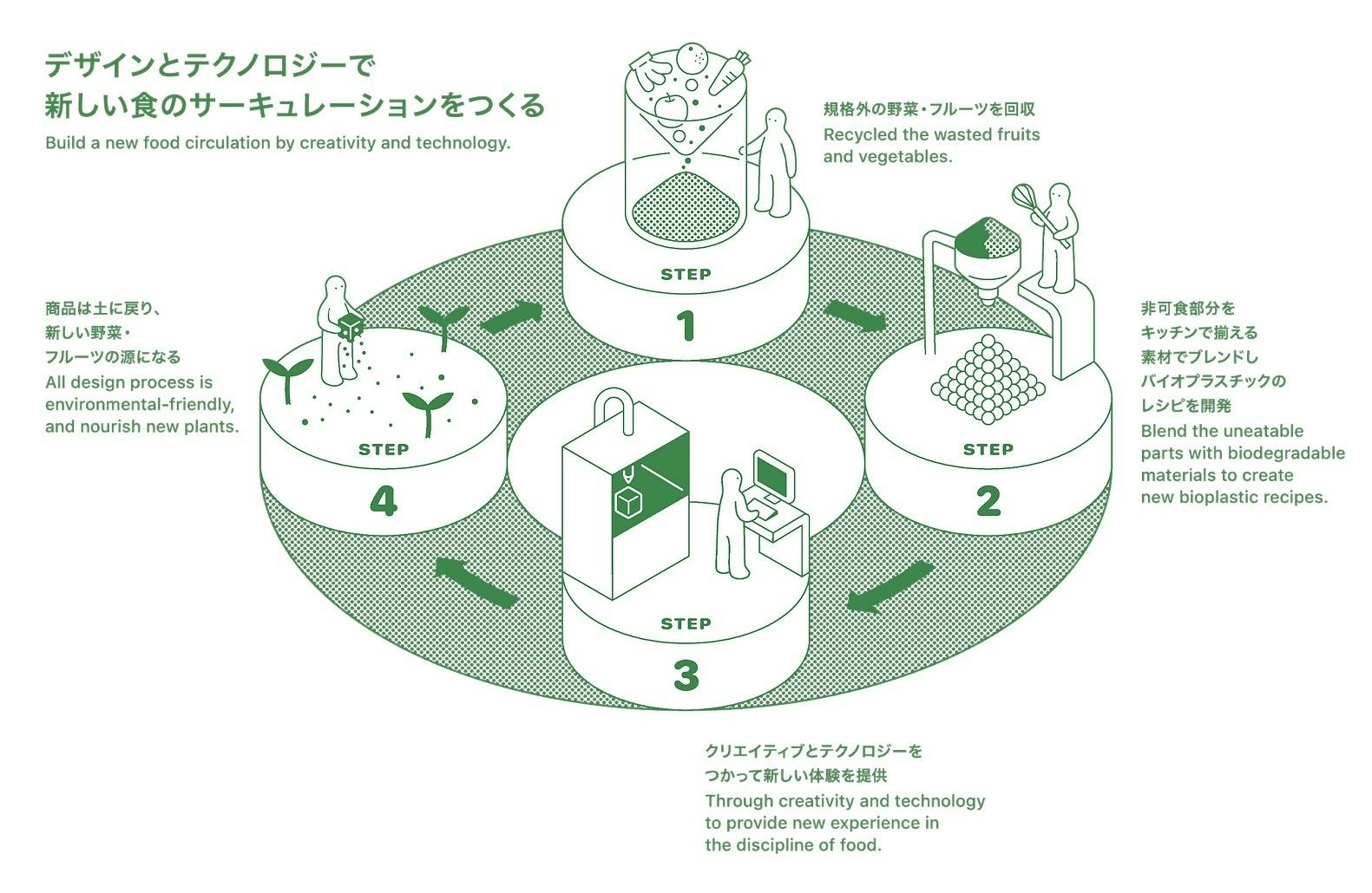 世界で捨てられる食べ物の量は年間25億トンと推計されており、その中には、食品として加工できない「隠れ食品ロス」が課題になっています。そこで、私たちは、さまざまな理由で捨てられる規格外の野菜、果物の残渣をプロダクトやインストレーションとして再生し、新しいサーキュレーションを作り出すことを目的としています。