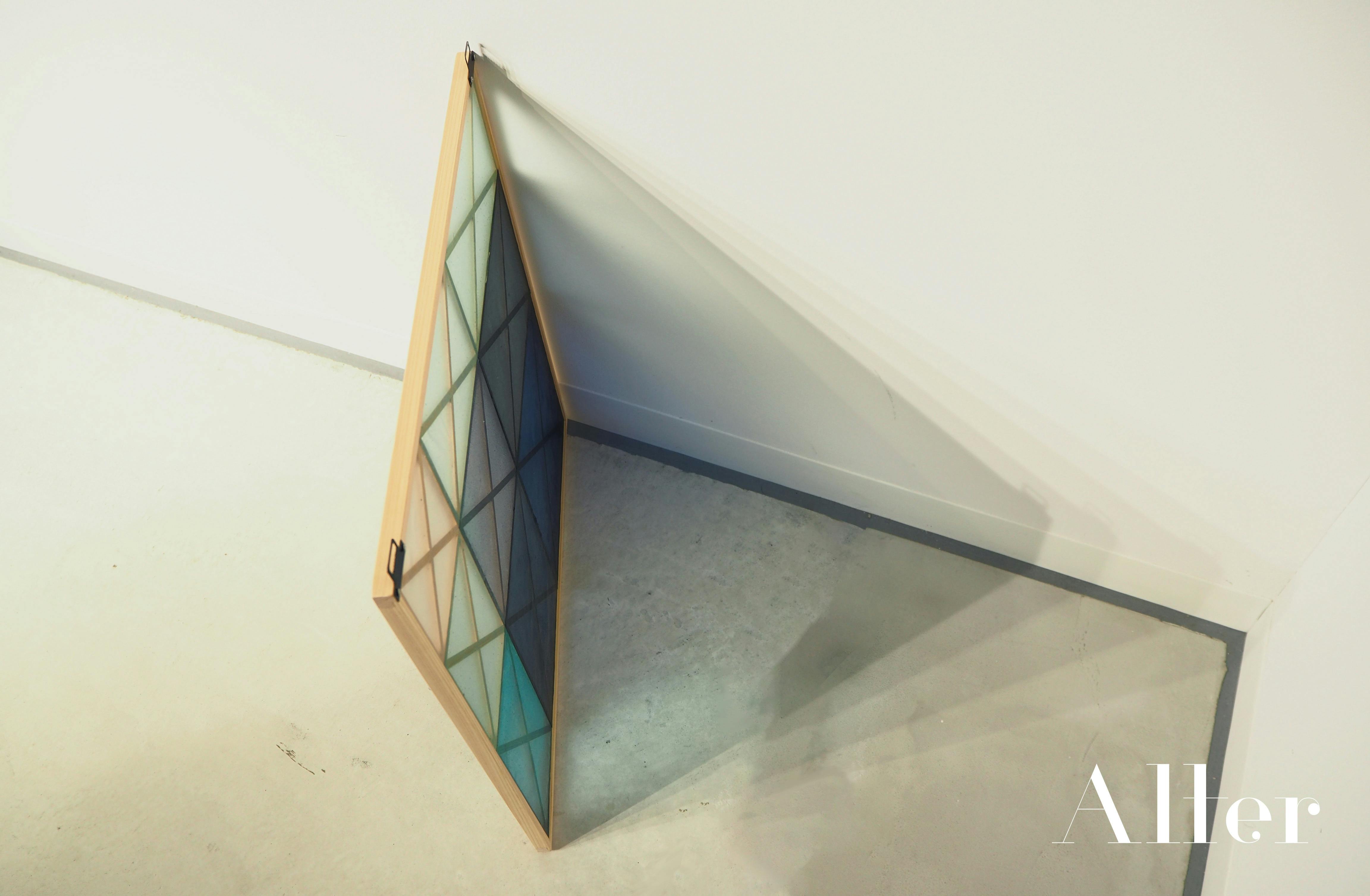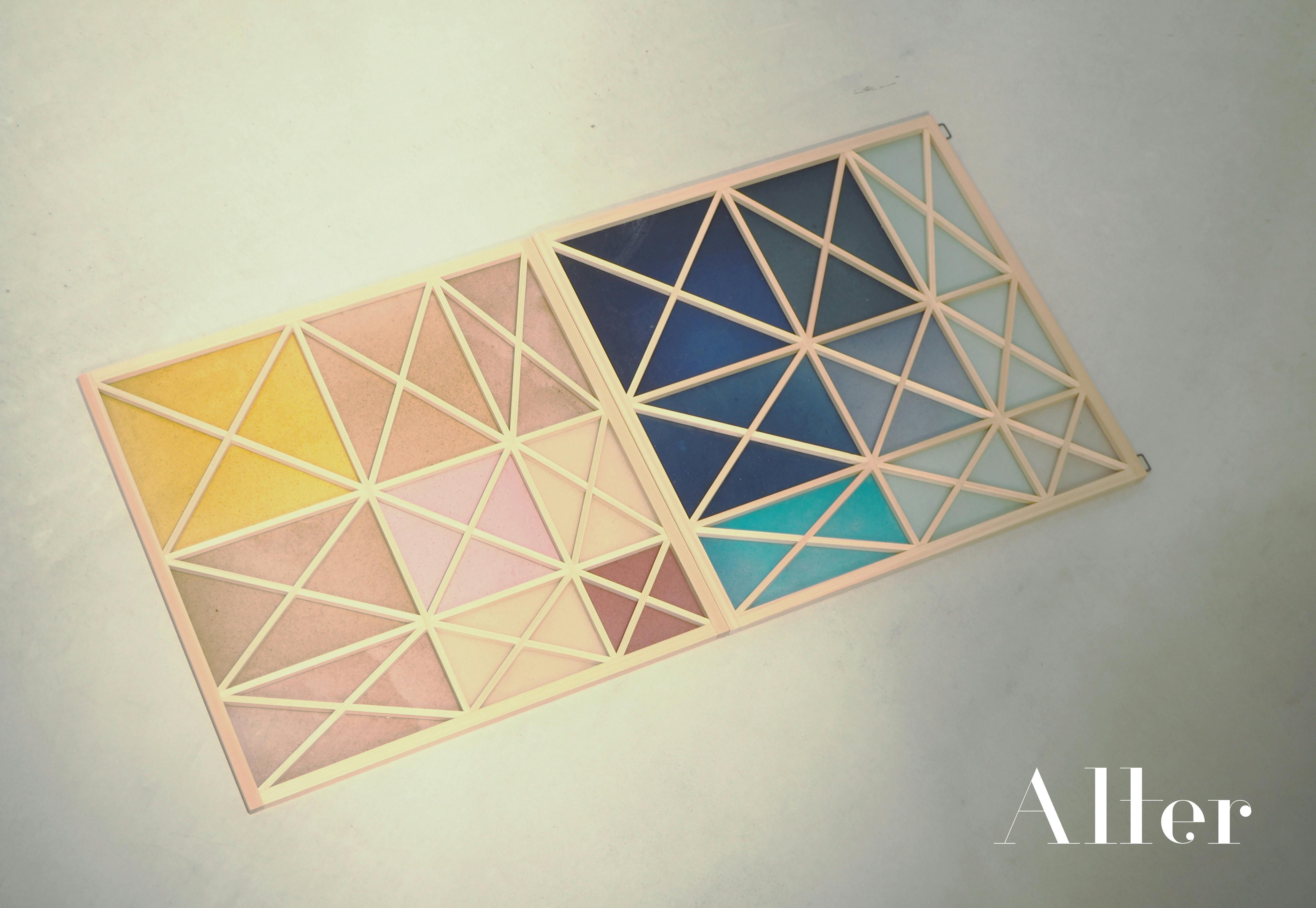 組子のデザインは、プログラミングによる「Gradient-XY」をテーマに、行と列ごとに一定の法則で線幅を徐々に変化させ、縦横方向のグラデーションの印象をダイナミックにしたものです。今回は、海藻の藍染めとみかん+ワイン粕の2種類のアートフレームを用意しています。