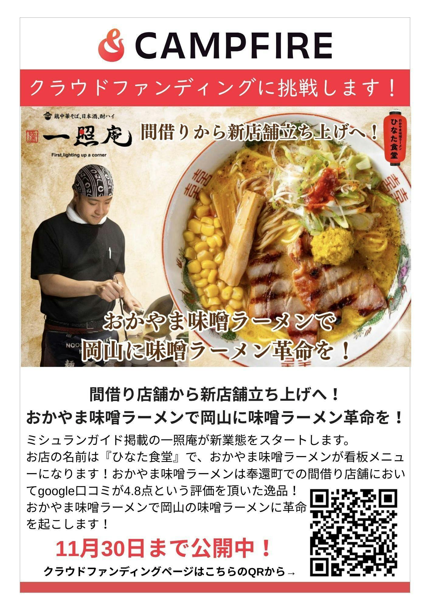 2025/10/19 18:02【お礼】前回のクラウドファンディングにご支援いただきまして誠にありがとうございました初めての挑戦で大変不安もありましたが皆様のお力添えのお陰で無事達成することが出来ました改めてお礼申し上げます【新たな挑戦】麺酒一照庵は明日の10月20日(月)12時公開で、新たなプロジェクトに挑戦します☆☆☆間借り店舗から新店舗立ち上げへ☆☆☆リンク→新たなプロジェクページはこちらから☆☆☆☆☆☆☆☆☆☆☆☆☆☆☆☆☆☆☆☆☆店主の地元奉還町での間借り営業から新店舗立ち上げ、そして新たなブランド『おかやま味噌ラーメン』を岡山ラーメン史に残すための挑戦です今回のプロジェクトにも共感いただけましたら、是非ご支援を賜りたく存じますそして、もし可能でしたら10月20日(月)12時公開時から24時間以内にご支援をいただければ大変嬉しいです理由としましては公開初期段階での伸びと人気ランキングの上位に入れるかどうかもプロジェクト成功の大変重要なカギとなります是非皆様のお力添えをいただければ幸いです大変不躾なお願いではありますが、今後とも麺酒一照庵を応援してくださいよろしくお願いします麺酒一照庵 創業者 大野 浩史・奉還町間借り店舗前にて・ もっと見る