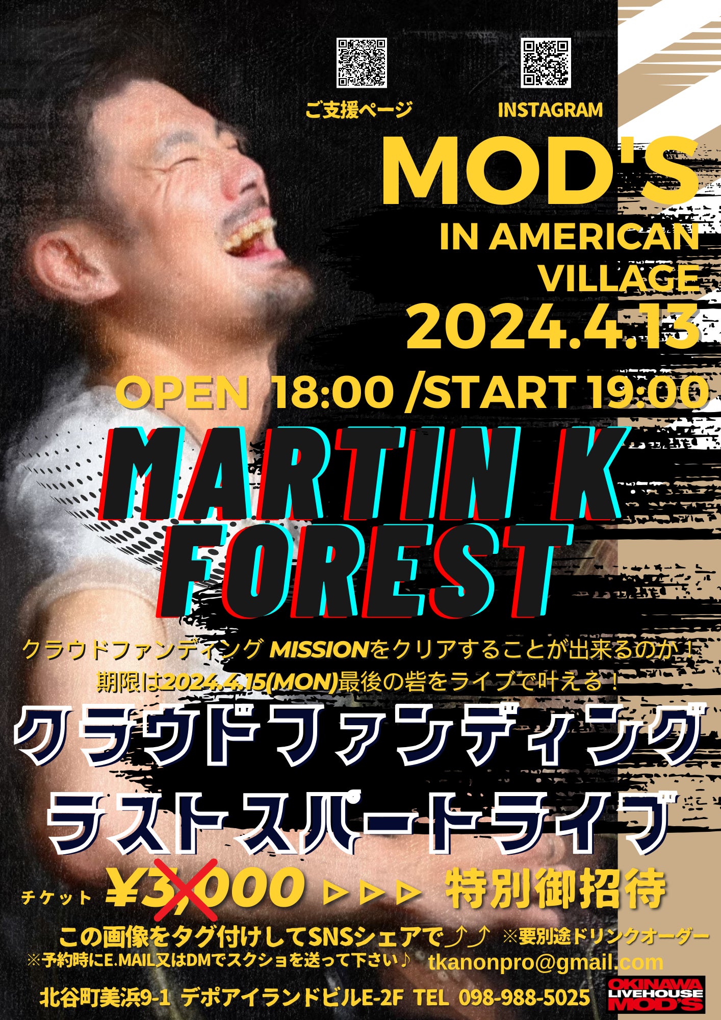 2024/03/25 23:504/13にラストスパートをライブで盛り上げていきます!北谷アメリカンビレッジのモッズにてライブ!18:00open 19:00start3,000円の所を、このポスターをシェアしてくれたかた、ご支援いただいてる方には特別ご招待券をおくばりしています。 もっと見る